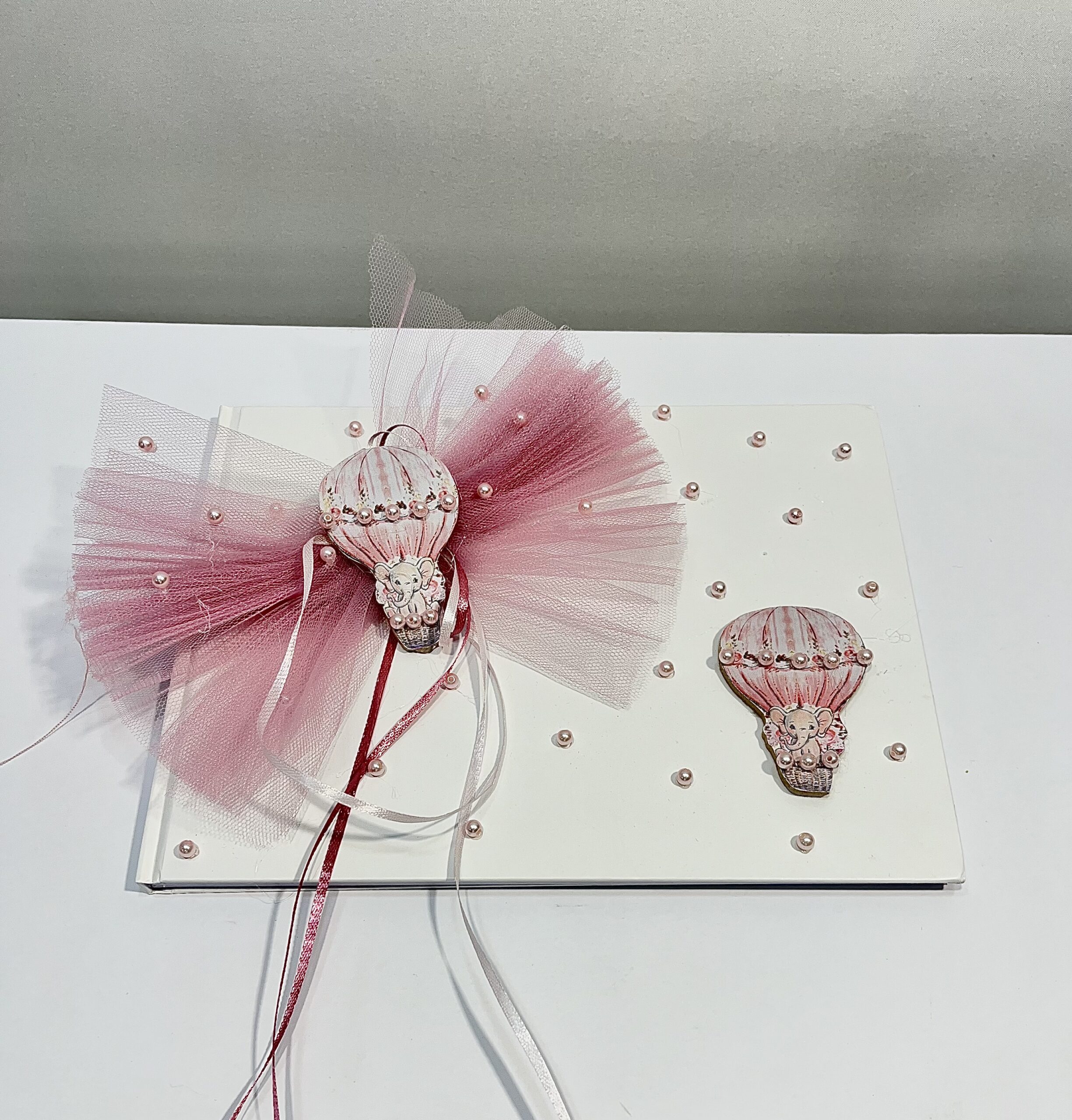 Χειροποίητο βιβλίο ευχών για κορίτσι με θέμα αερόστατο, τούλινο φιόγκο σάπιο μήλο και πέρλες.