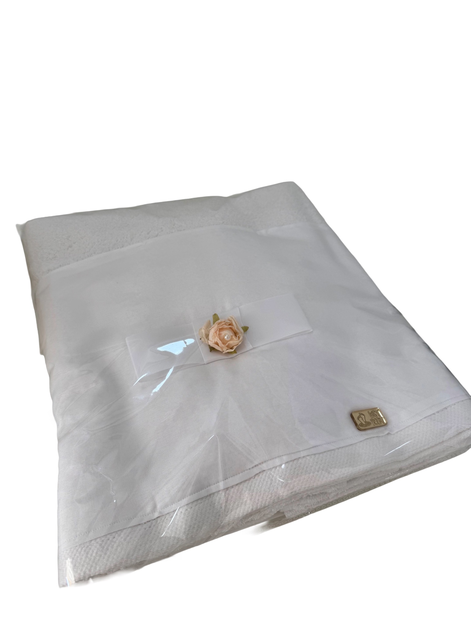 Χειροποίητο σετ με λαδόπανα για κορίτσι, με εκρού φάσα, καραβόσχοινο και διακοσμητικό λευκό τριαντάφυλλο.