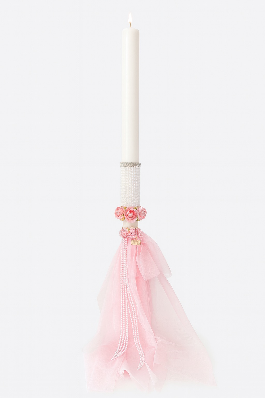 Χειροποίητη λαμπάδα και μπρανς με μονόγραμμα της επιλογής σας, βελούδο σάπιο μήλο, ροζ τούλι και διακοσμητικά λουλούδια.