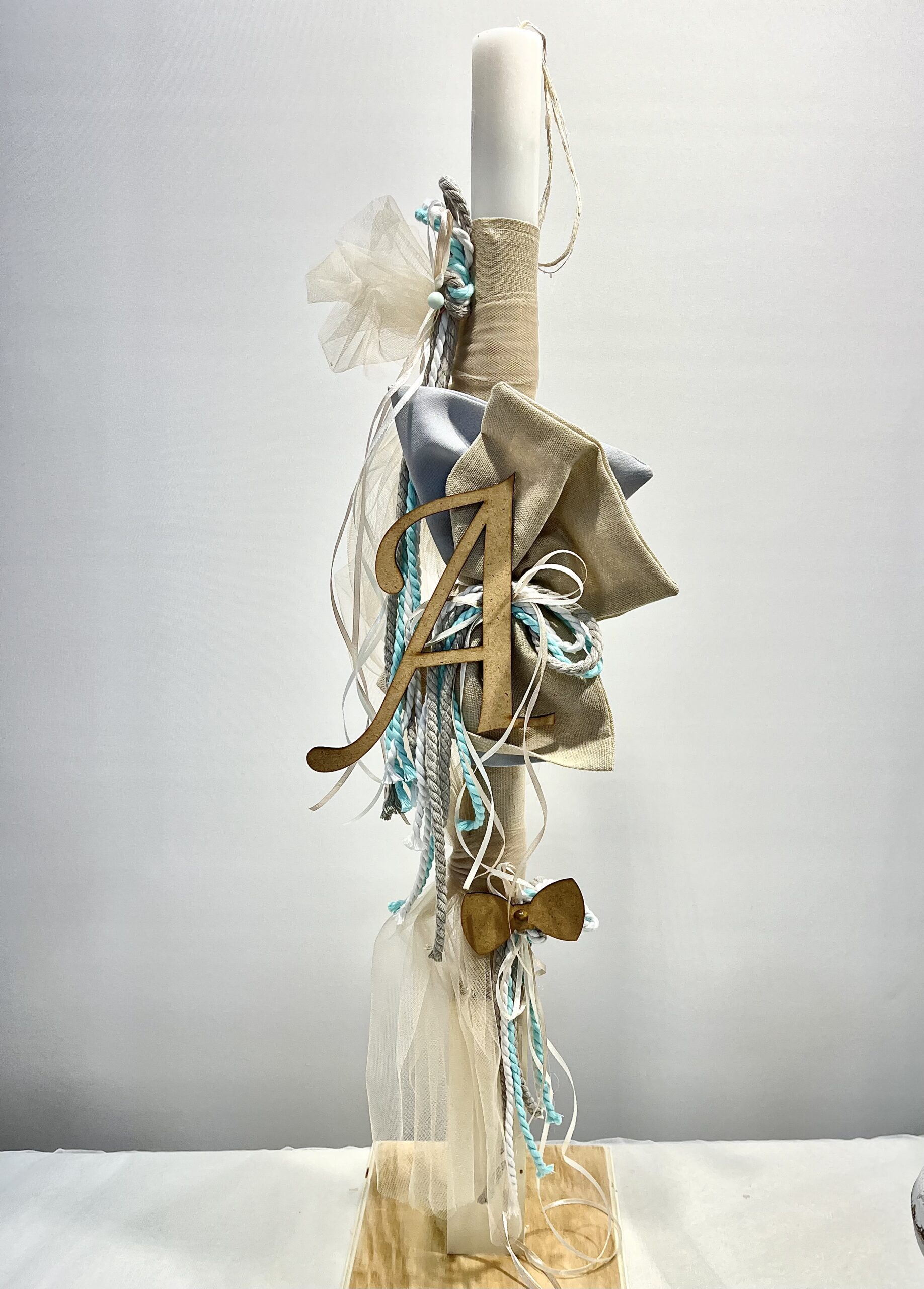 Χειροποίητη λαμπάδα και μπρανς για αγόρι, με μονόγραμμα της επιλογής σας και παπιγιόν. Με εκρού και γαλάζιο πανί, βεραμάν και εκρού σχοινί, εκρού κορδέλα και διακοσμητική γαλάζια χάντρα.