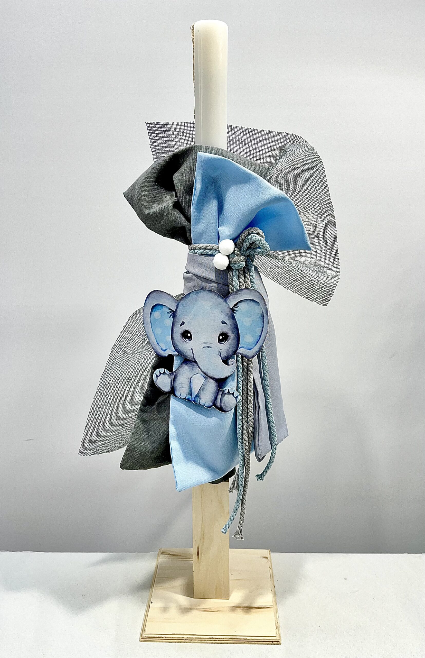Χειροποίητη λαμπάδα και μπρανς για αγόρι, με θέμα ελεφαντάκι Με γκρι και γαλάζιο πανί, γκρι και γαλάζιο καραβόσχοινο και λευκά πον πον.