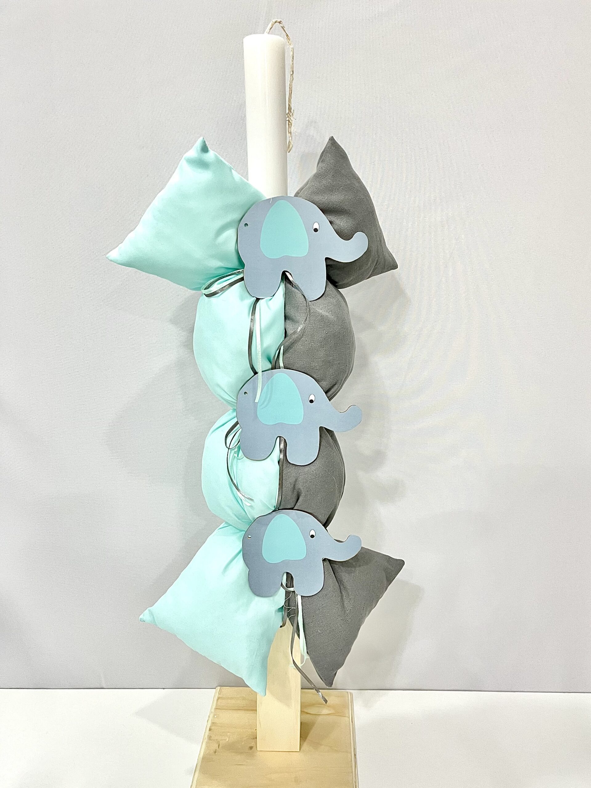 Χειροποίητη λαμπάδα και μπρανς για αγόρι, με θέμα ελεφαντάκια. Με βεραμάν και γκρι μαξιλαράκια και γκρι και βεραμάν κορδέλες.