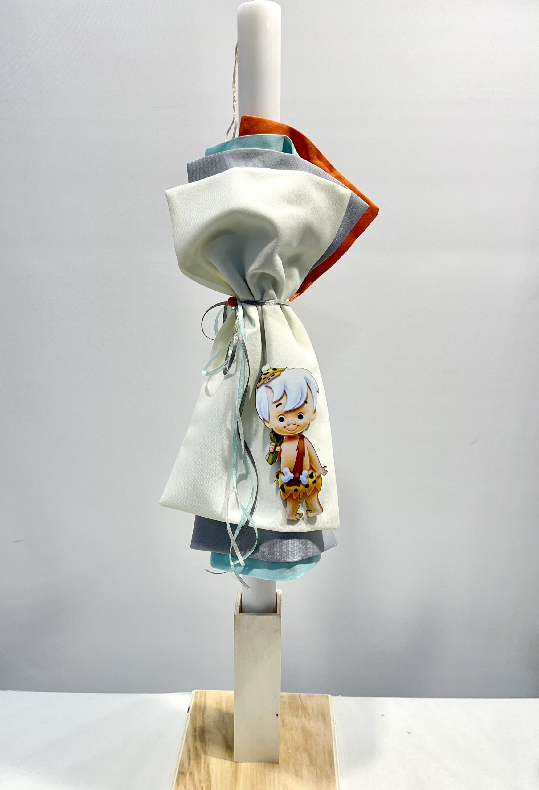 Χειροποίητη λαμπάδα και μπρανς για αγόρι, με θέμα Φλίνγκστοουν. Με πορτοκαλί, γαλάζιο, βεραμάν και εκρού πανί, γκρι, βεραμάν και εκρού κορδέλα και διακοσμητική πορτοκαλί χάντρα.