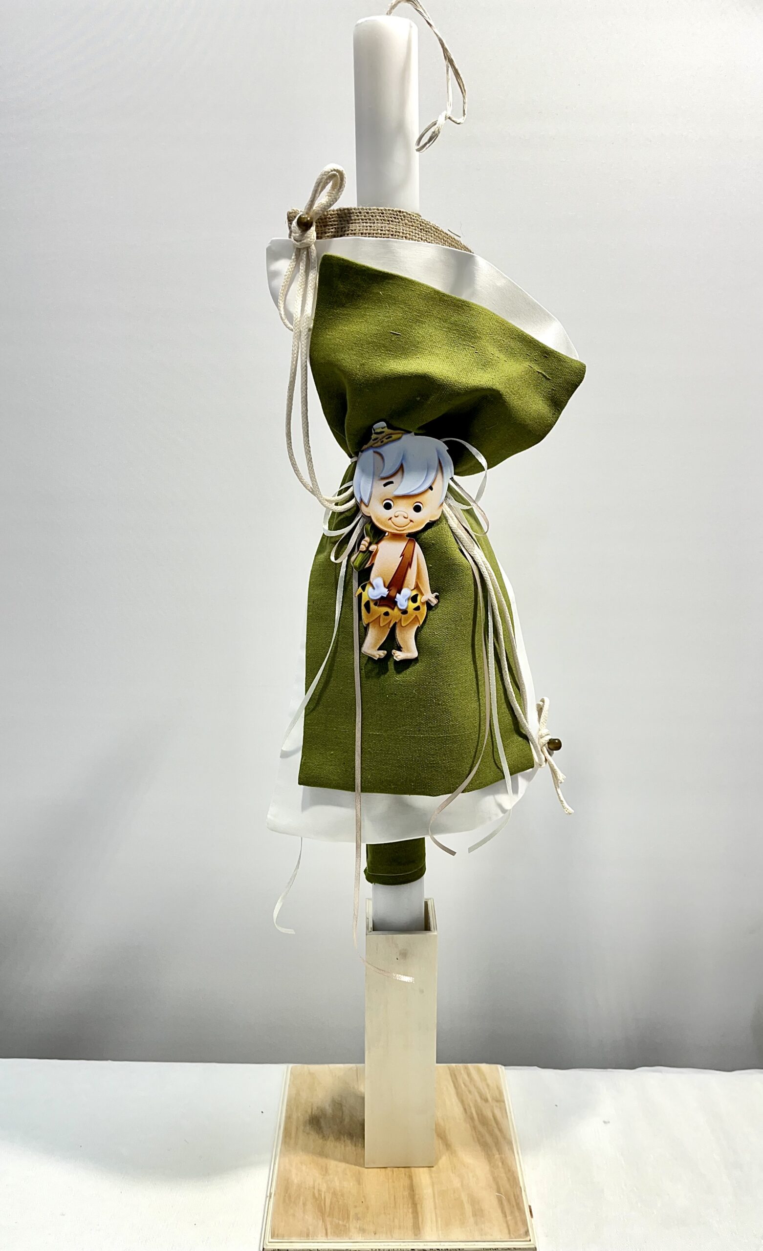 Χειροποίητη λαμπάδα και μπρανς για αγόρι, με θέμα Φλίνστοουν. Με λευκό και λαδί πανί, εκρού σχοινί, λευκή και εκρού κορδέλα και διακοσμητική καφέ χάντρα.