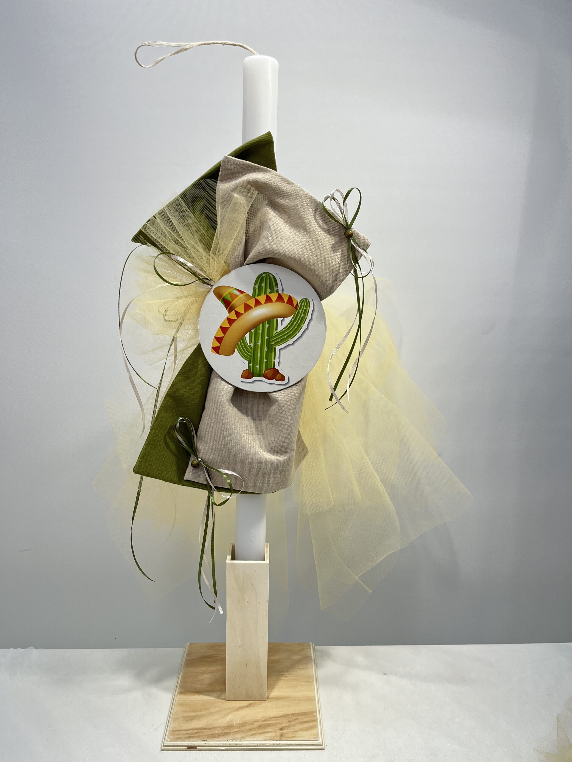 Χειροποίητη λαμπάδα και μπρανς για αγόρι, με θέμα Κάκτος. Με λαδί και εκρού πανί και κορδέλα.