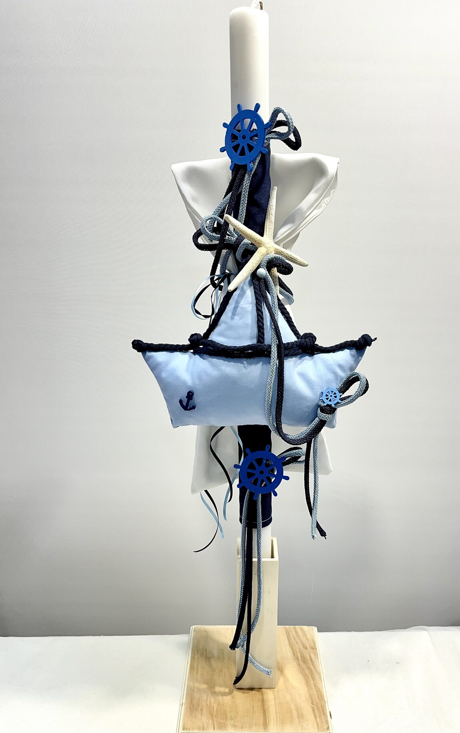 Χειροποίητη λαμπάδα και μπρανς για αγόρι, με θέμα καραάβι. Με εκρού πανί, λευκό και μπλε καραβόσχοινο, διακοσμητικό αστερία, αγκυρούλα και τιμονάκια.