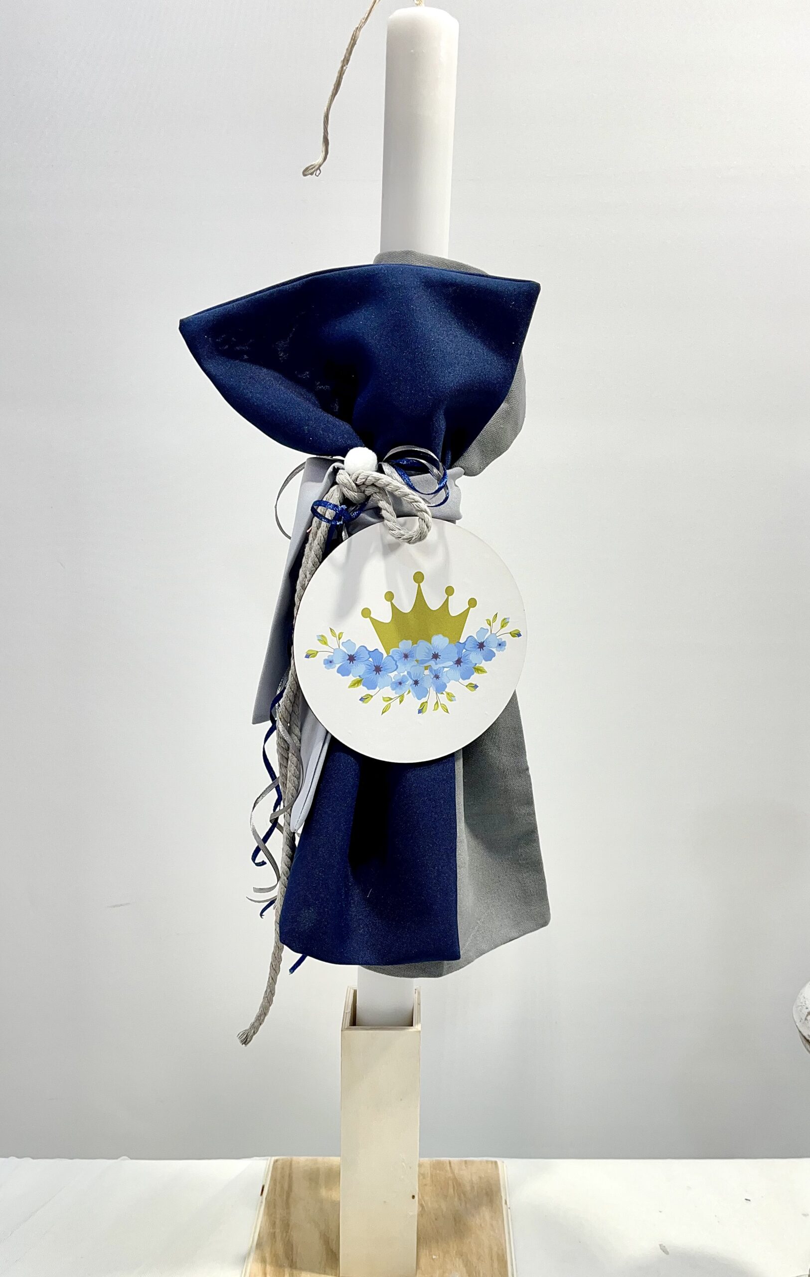 Χειροποίητη λαμπάδα και μπρανς για αγόρι, με θέμα κορώνα. Με γκρι και μπλε πανί, γκρι σχοινί, μπλε και γκρι κορδέλα και λευκό πον πον.