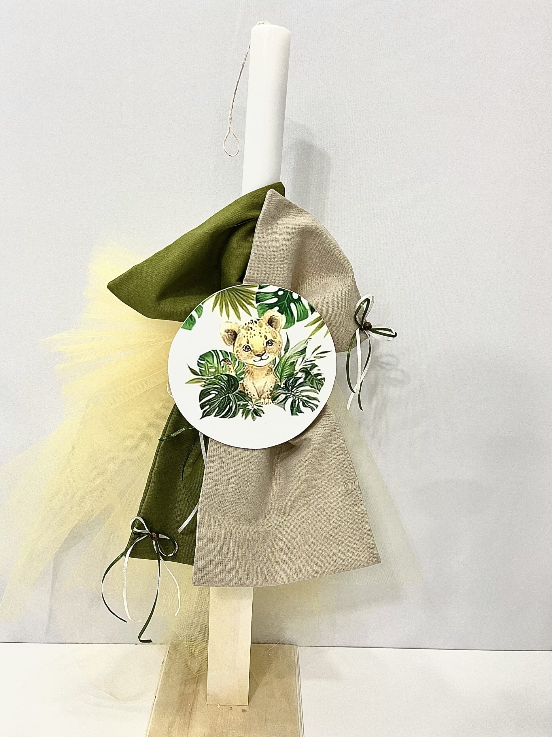 Χειροποίητη λαμπάδα και μπρανς για αγόρι, με θέμα τιγράκι. Με κίτρινο τούλι, λαδί και εκρού πανί, λευκή και λαδί κορδέλα και διακοσμητική καφέ χάντρα.