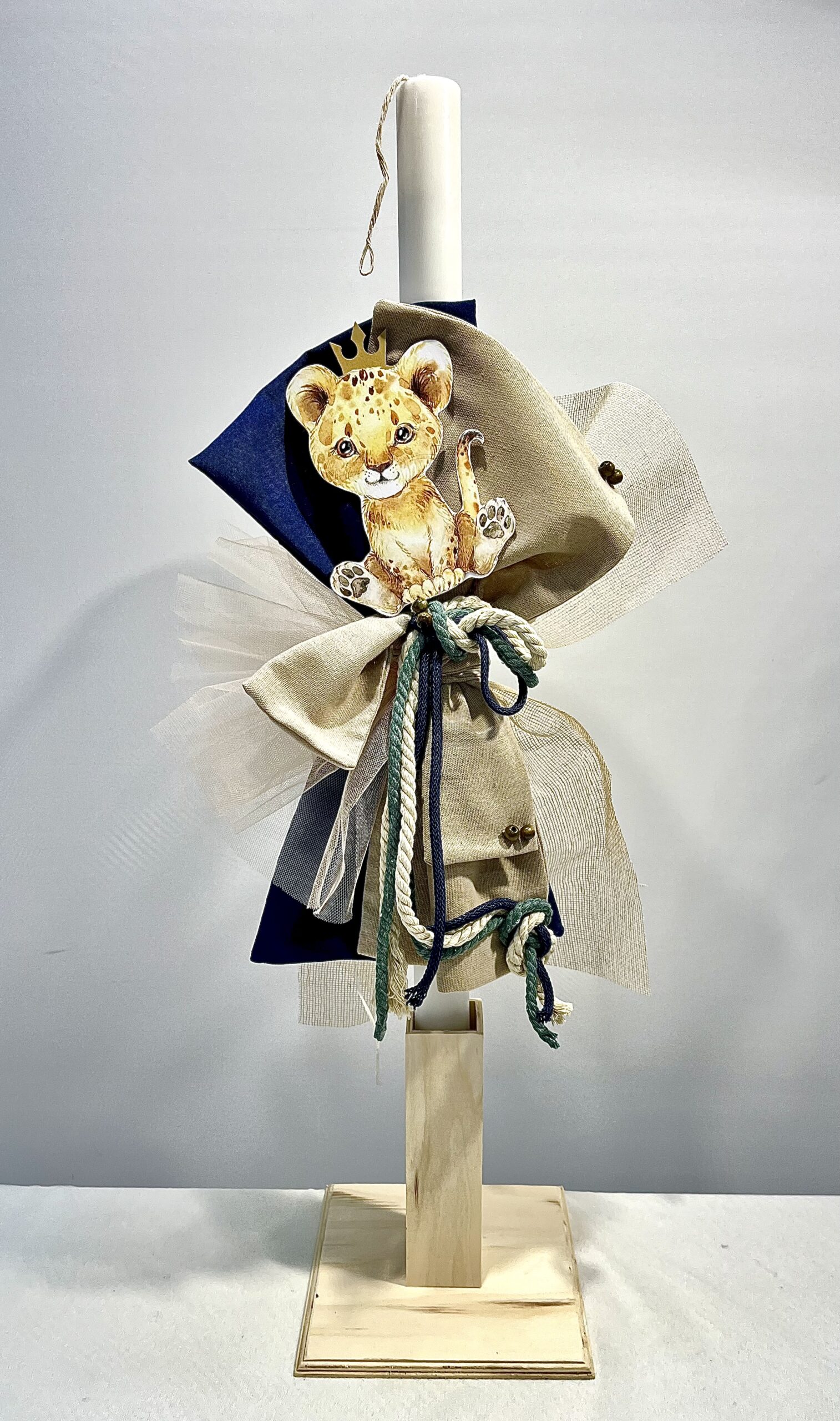 Χειροποίητη λαμπάδα και μπρανς για αγόρι, με θέμα τιγράκι. Με μπεζ και μπλε πανί, εκρού τούλι καικαραβόσχοινο.