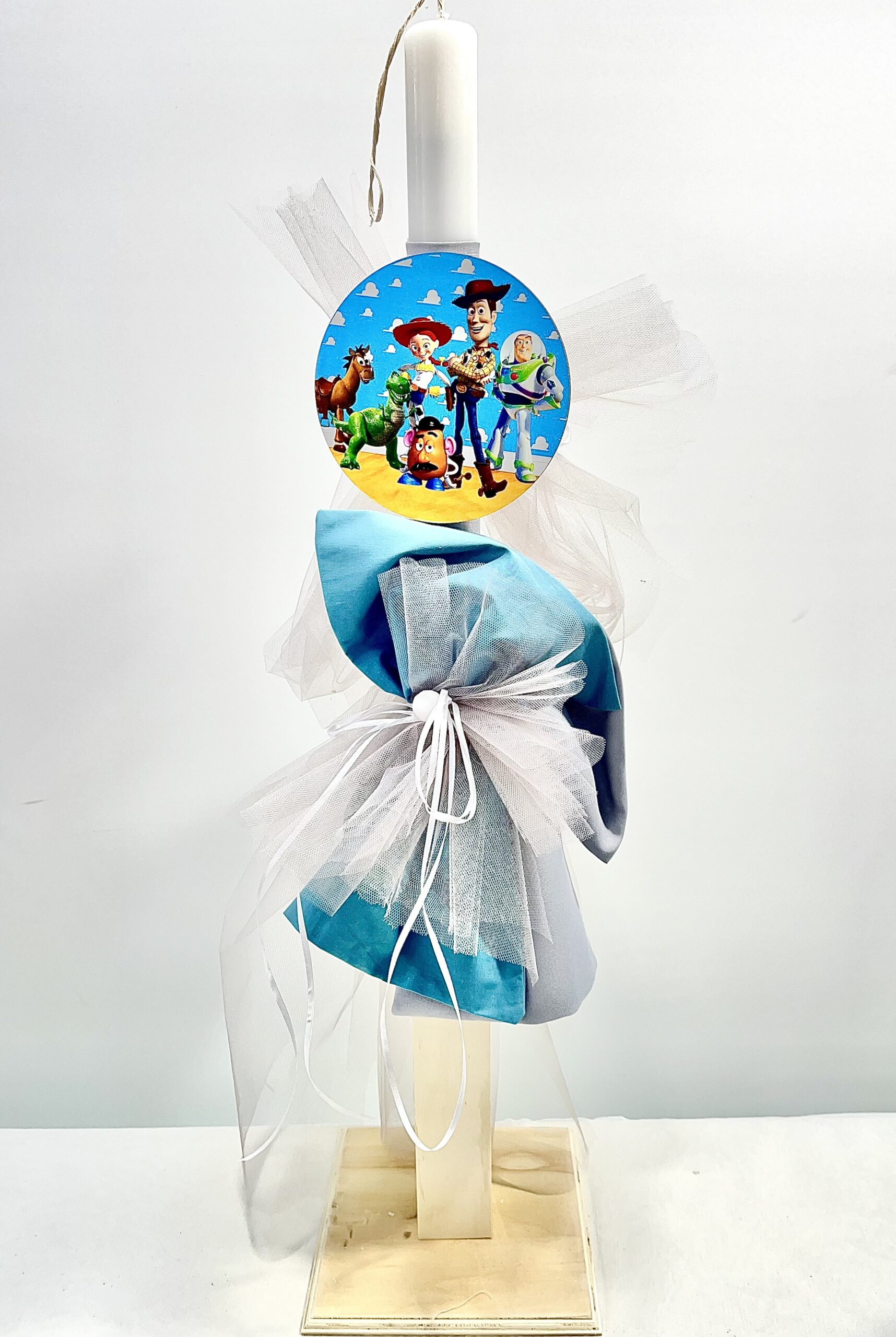 Χειροποίητη λαμπάδα και μπρανς για αγόρι με θέμα Toy Story. Με γαλάζιο πανί, λευκό τούλι, λευκή κορδέλα και λευκά πον πον.