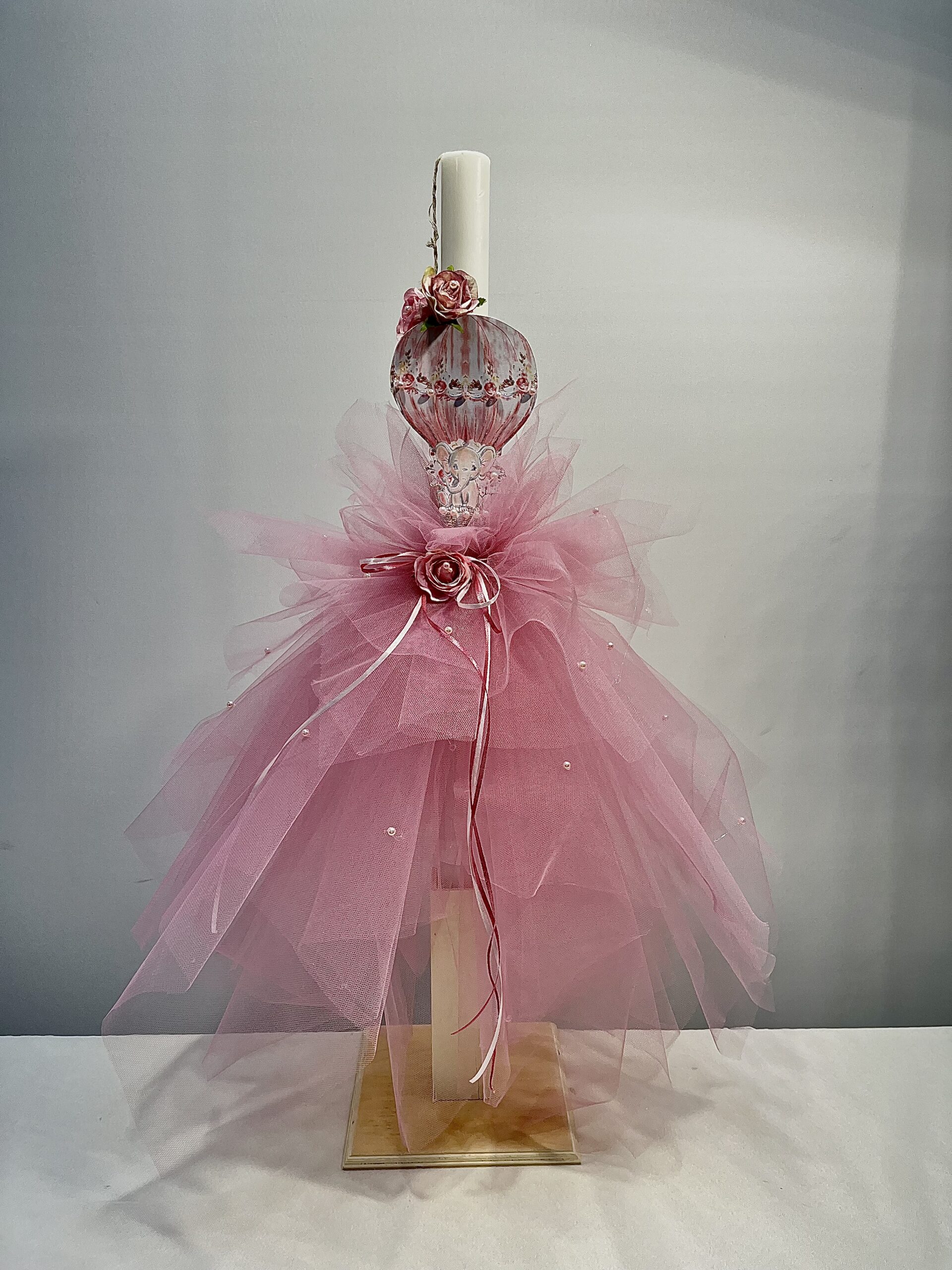 Χειροποίητη λαμπάδα και μπρανς για κορίτσι, με θέμα αερόστατο. Με τούλι σάπιο μήλο, πέρλες και διακοσμητικό τριαντάφυλλο.