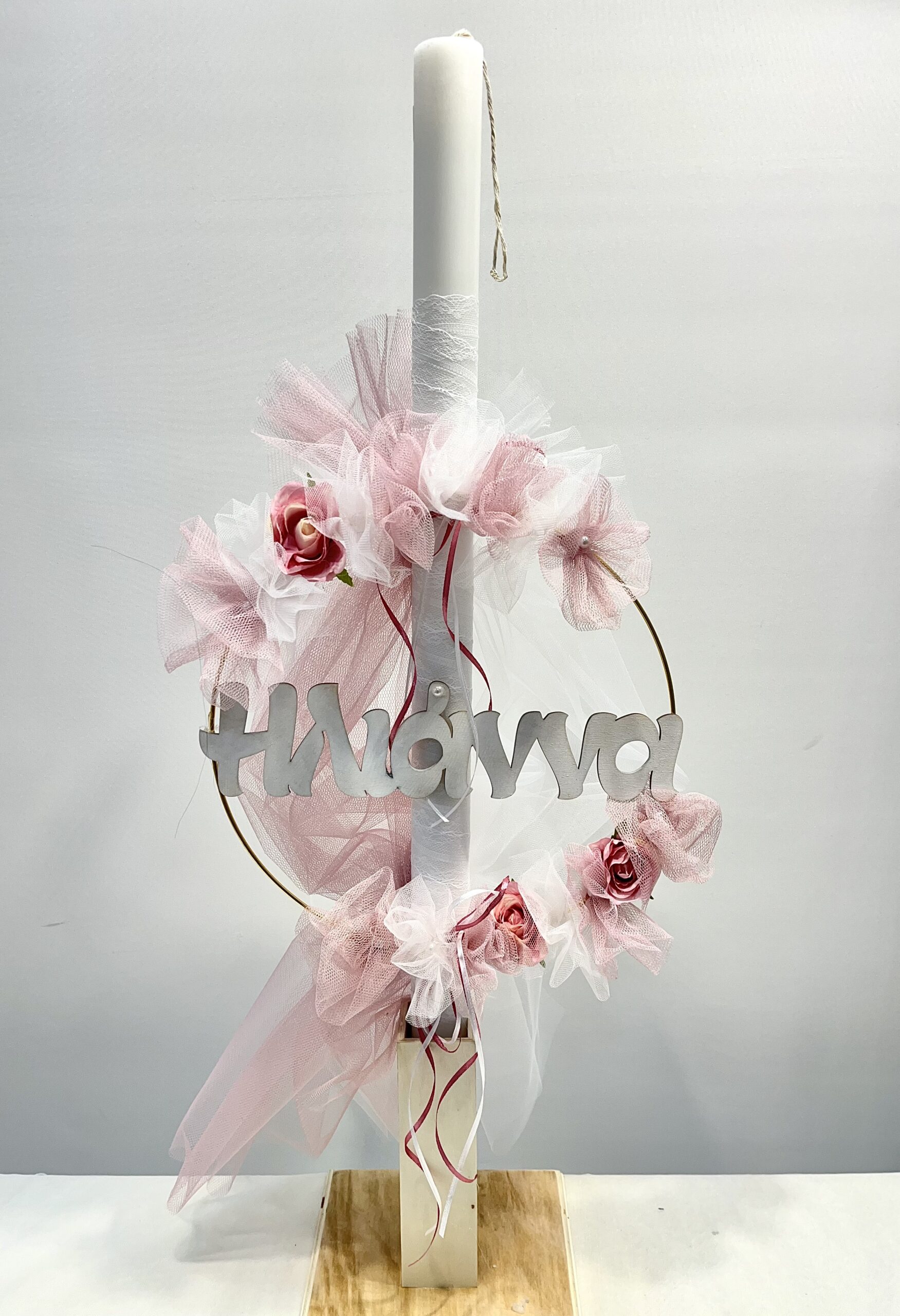 Χειροποίητη λαμπάδα και μπρανς με μονόγραμμα της επιλογής σας, βελούδο σάπιο μήλο, ροζ τούλι και διακοσμητικά λουλούδια.