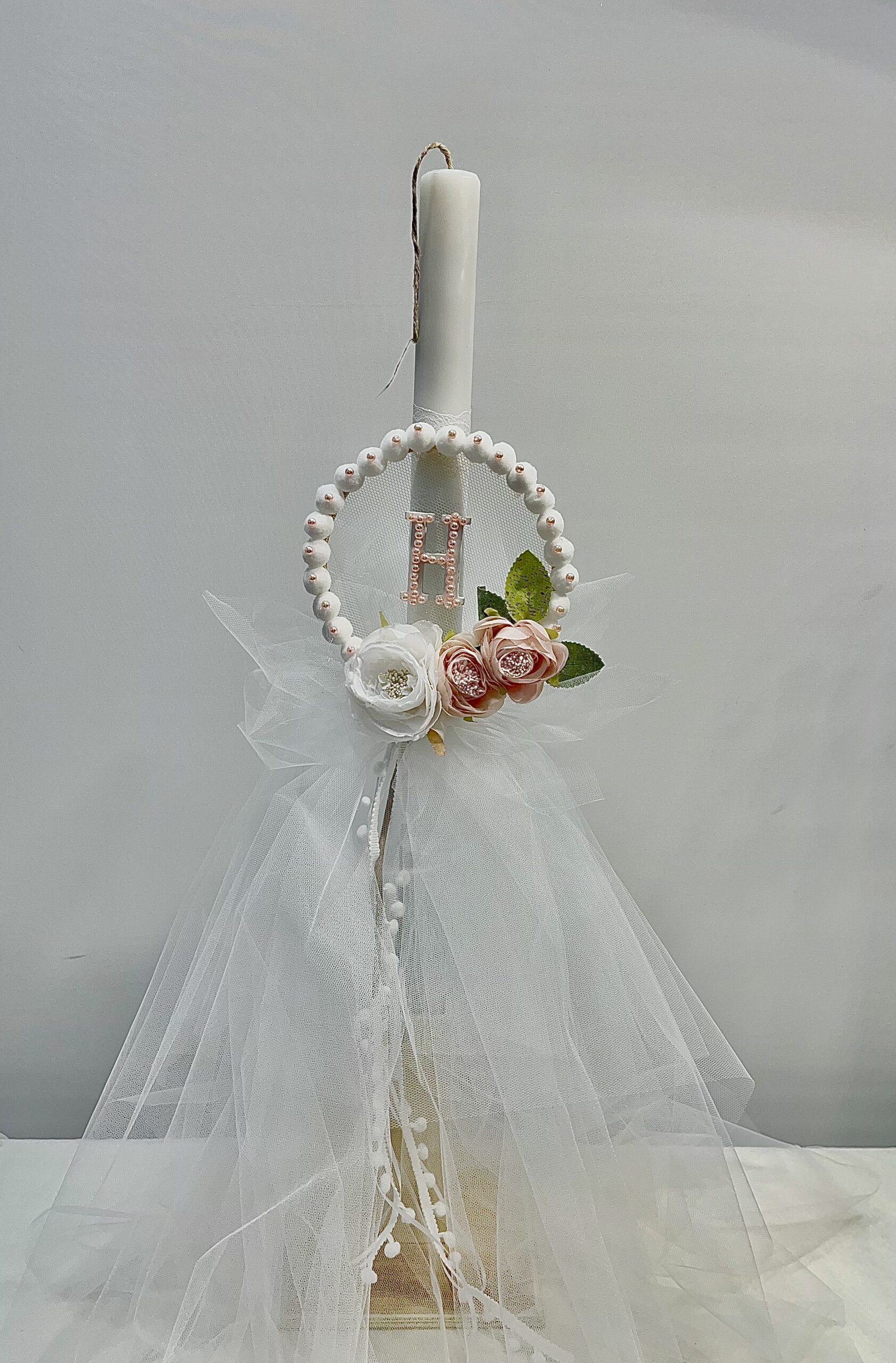 Χειροποίητη λαμπάδα και μπρανς για κορίτσι, με θέμα ονειροπαγίδα. Με λευκό και ροζ τούλι και διακοσμητικά λευκά τριαντάφυλλα.