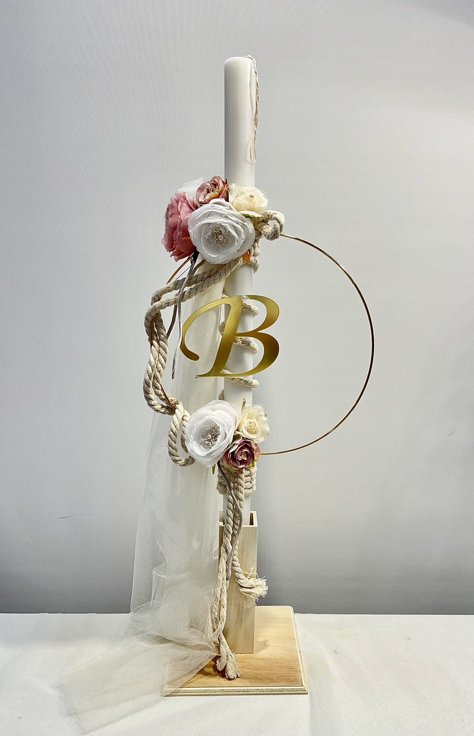 Χειροποίητη λαμπάδα και μπρανς με μονόγραμμα της επιλογής σας, βελούδο σάπιο μήλο, ροζ τούλι και διακοσμητικά λουλούδια.