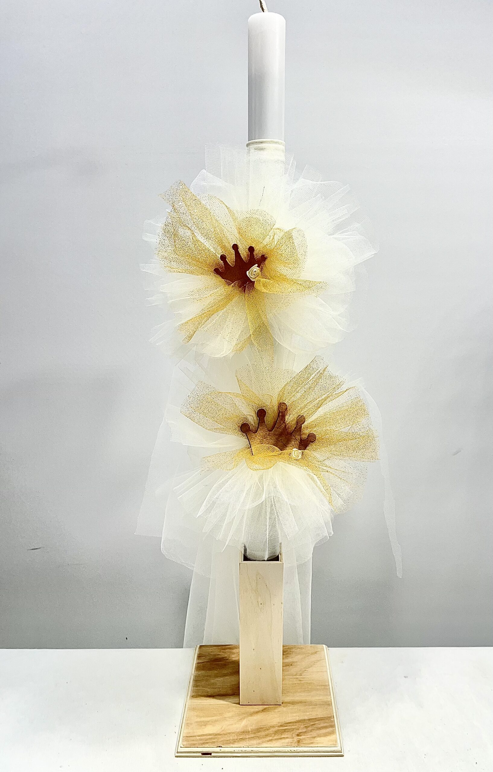 Χειροποίητη λαμπάδα και μπρανς για κορίτσι, με θέμα κορώνα. Με λευκό και χρυσό τούλι και διακοσμητικά λευκά λουλούδια.