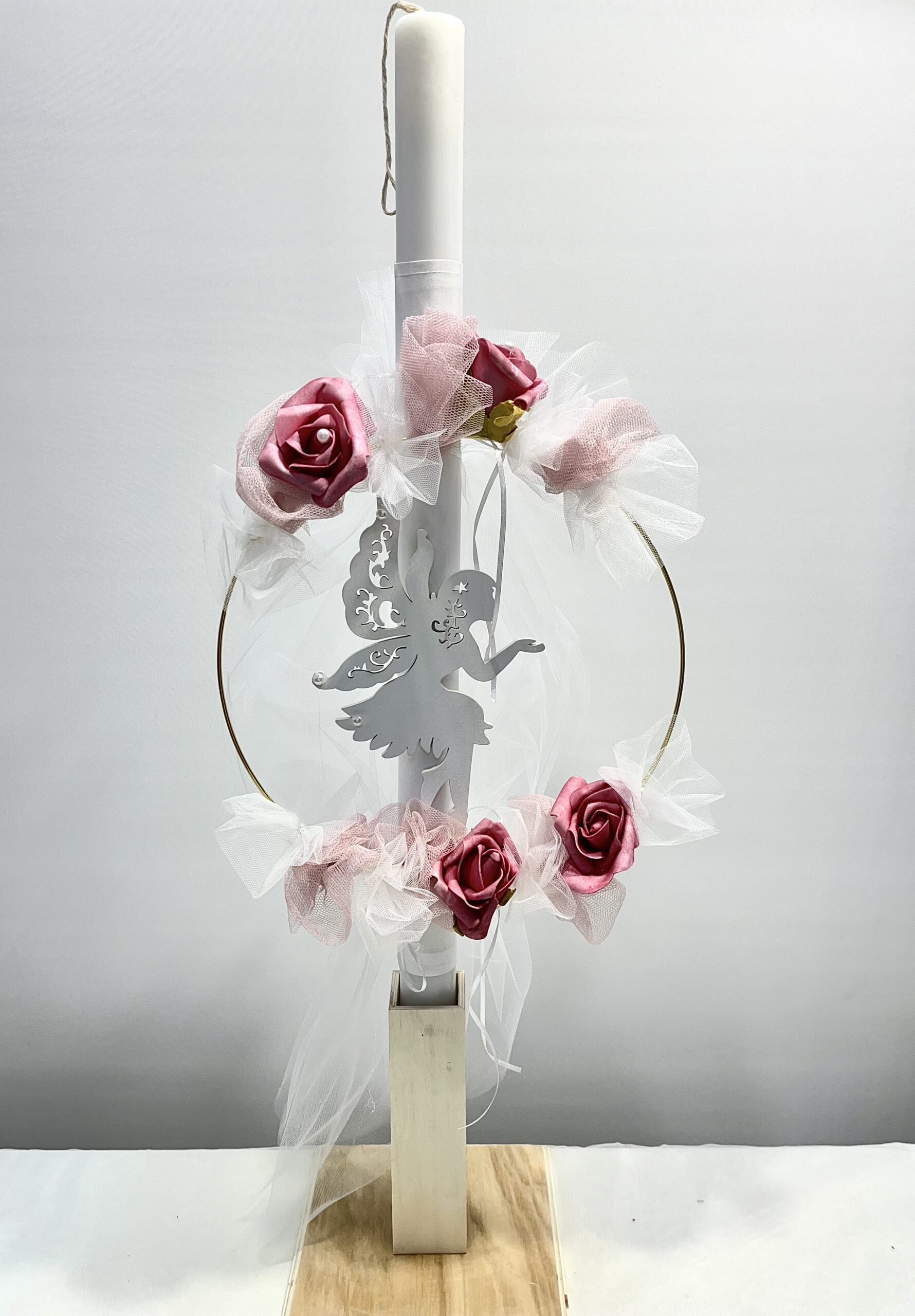 Χειροποίητη λαμπάδα και μπρανς για κορίτσι, με θέμα ονειροπαγίδα. Με λευκό τούλι, διακοσμητικά λευκά και ροζ τριαντάφυλλα και πέρλες.