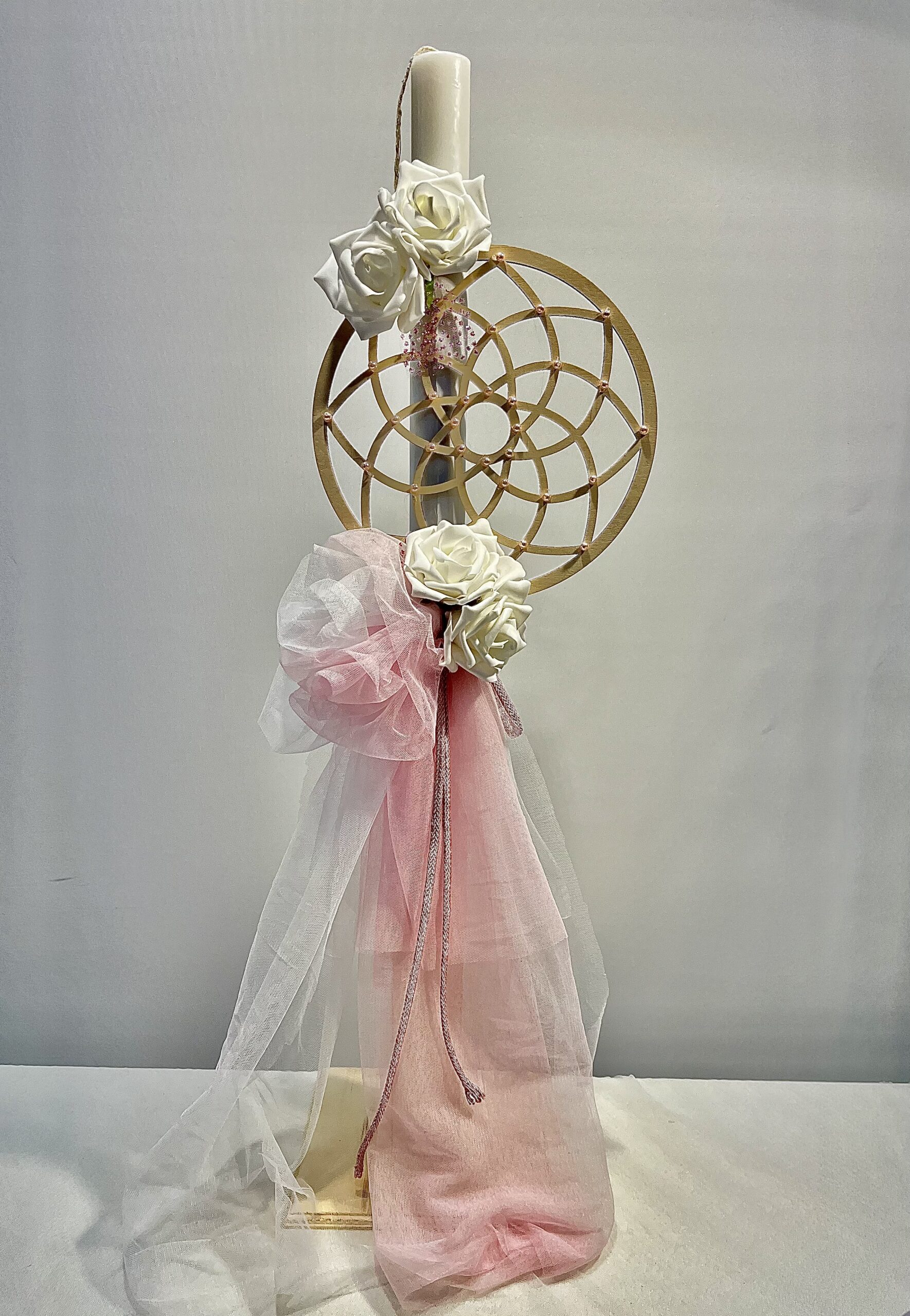 Χειροποίητη λαμπάδα και μπρανς για κορίτσι, με θέμα ονειροπαγίδα. Με λευκό και ροζ τούλι και διακοσμητικά λευκά τριαντάφυλλα.