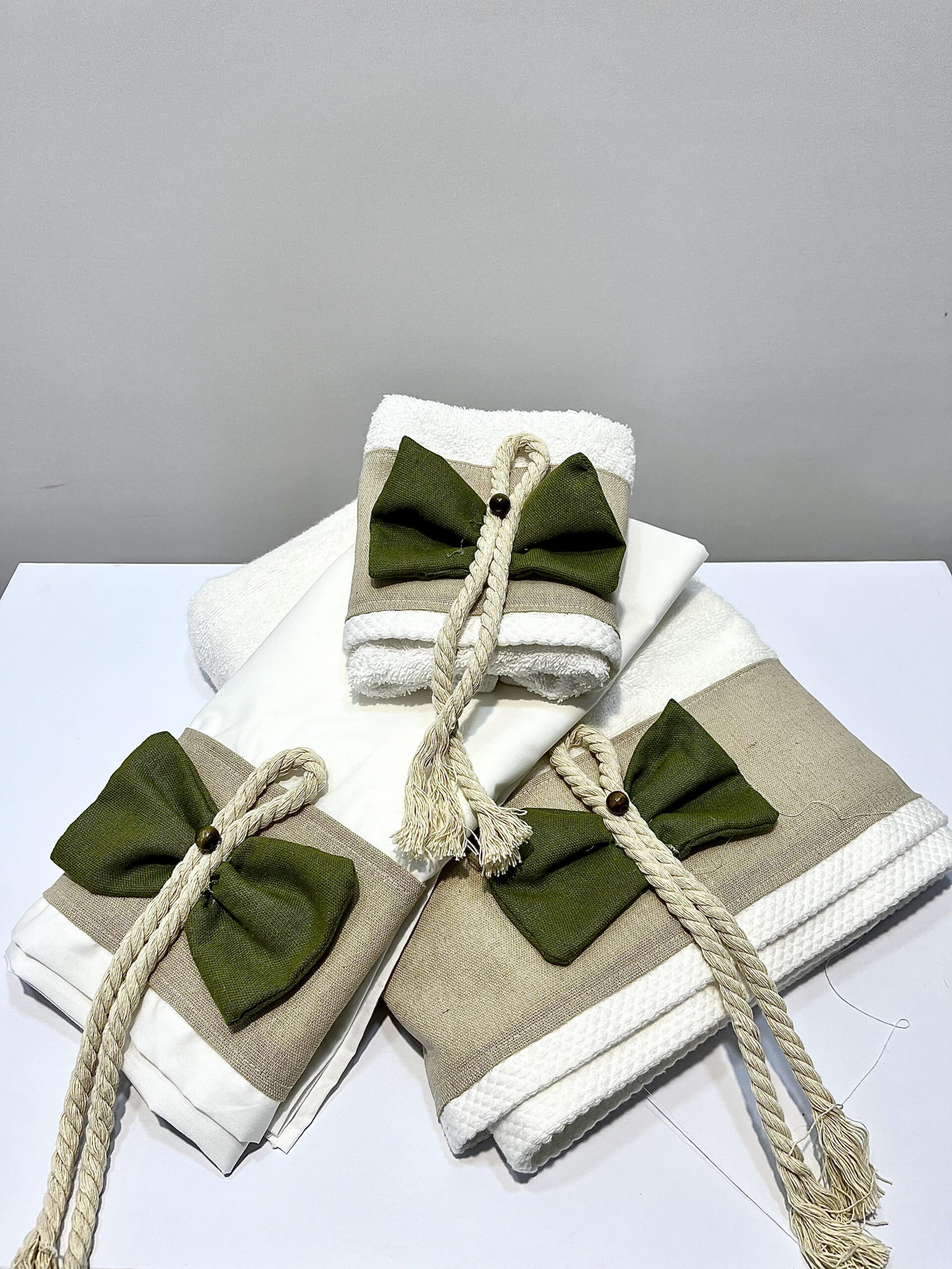 Χειροποίητο σετ με λαδόπανα για αγόρι, με εκρού φάσα, λαδί φιόγκο, καραβόσχοινο και καφέ χάντρα.