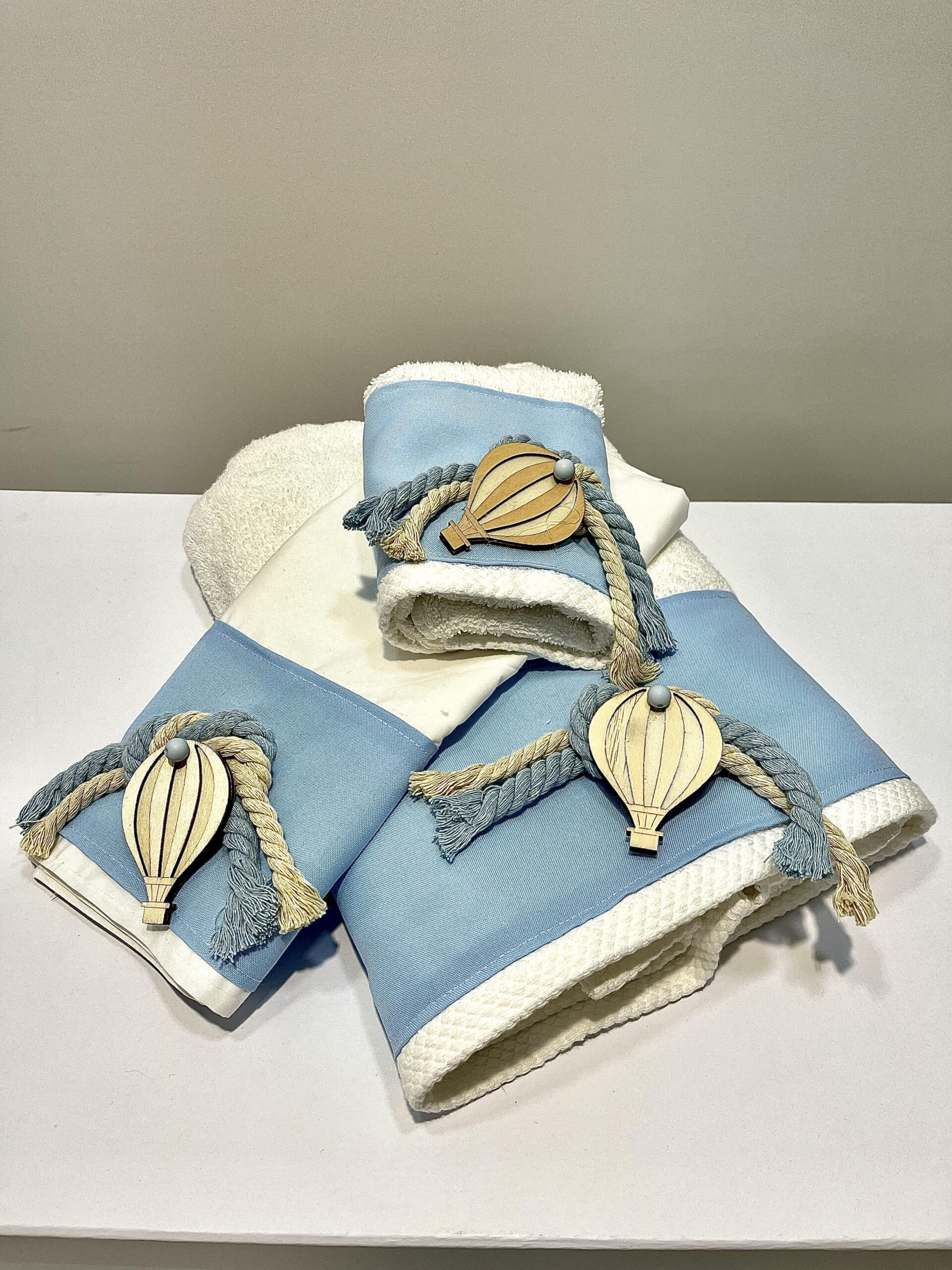 Χειροποίητο σετ με λαδόπανα για αγόρι με θέμα αερόστατο, με γαλάζια φάσα, εκρού και γαλάζιο καραβόσχοινο και διακοσμητική γαλάζια χάντρα.