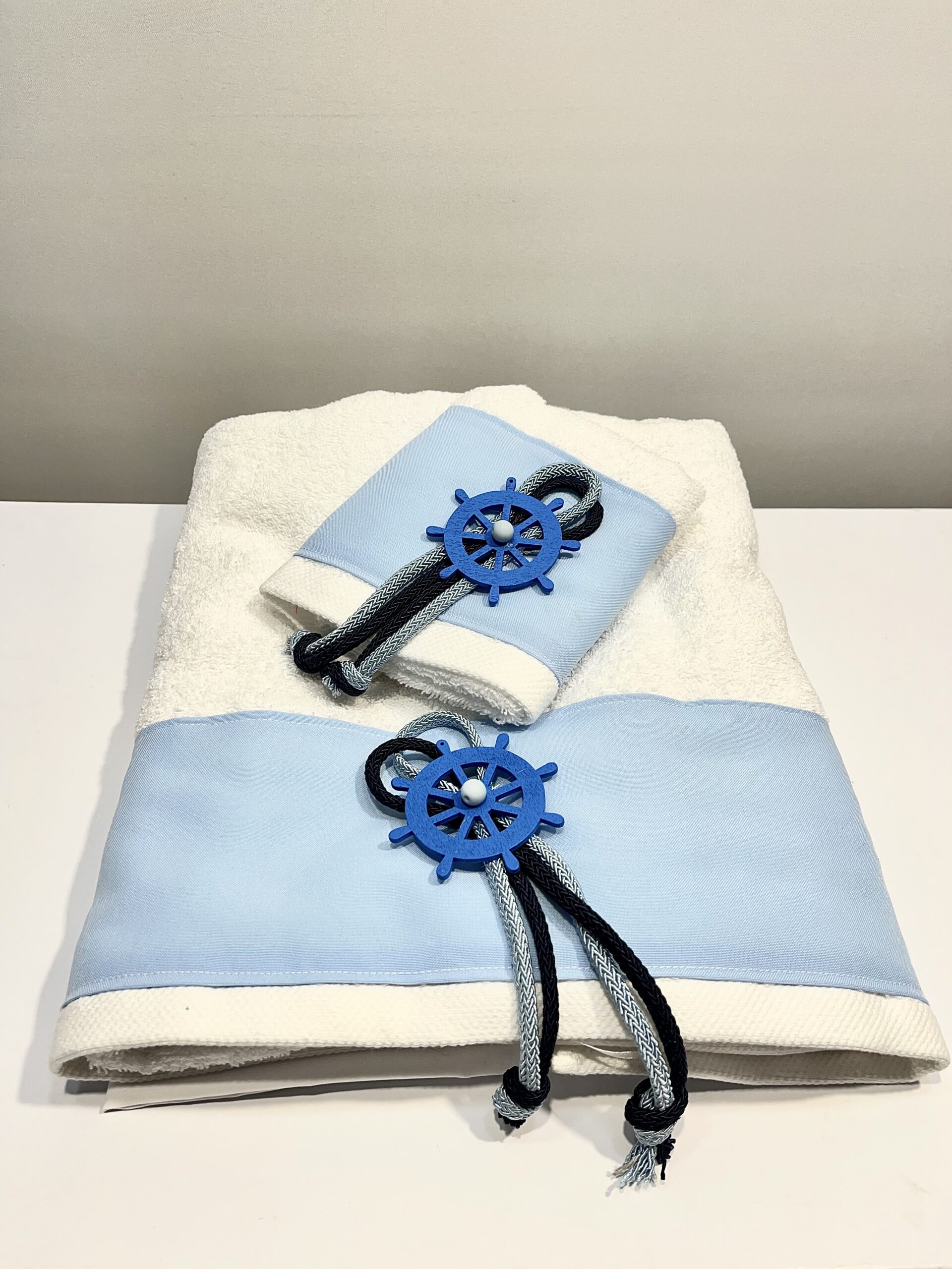 Χειροποίητο σετ λαδόπανα για αγόρι, με γαλάζια φάσα, καραβόσχοινο, μπλε τιμονάκι και διακοσμητική γαλάζια χάντρα .