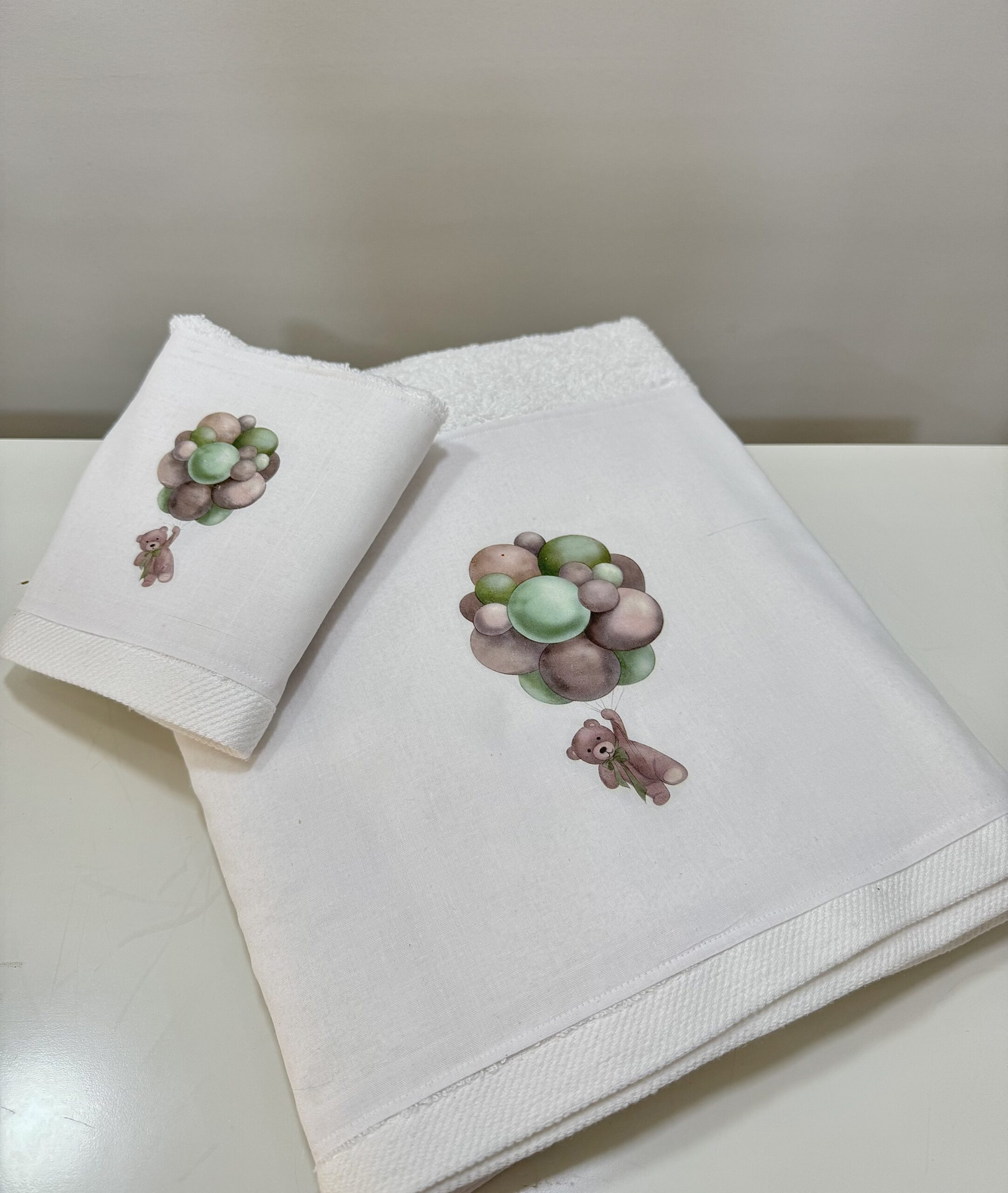 Χειροποίητο σετ με λαδόπανα για κορίτσι, με λευκή φάσα, ροζ τούλινο φιόγκο και διακοσμητικά τριανταφυλλάκια.
