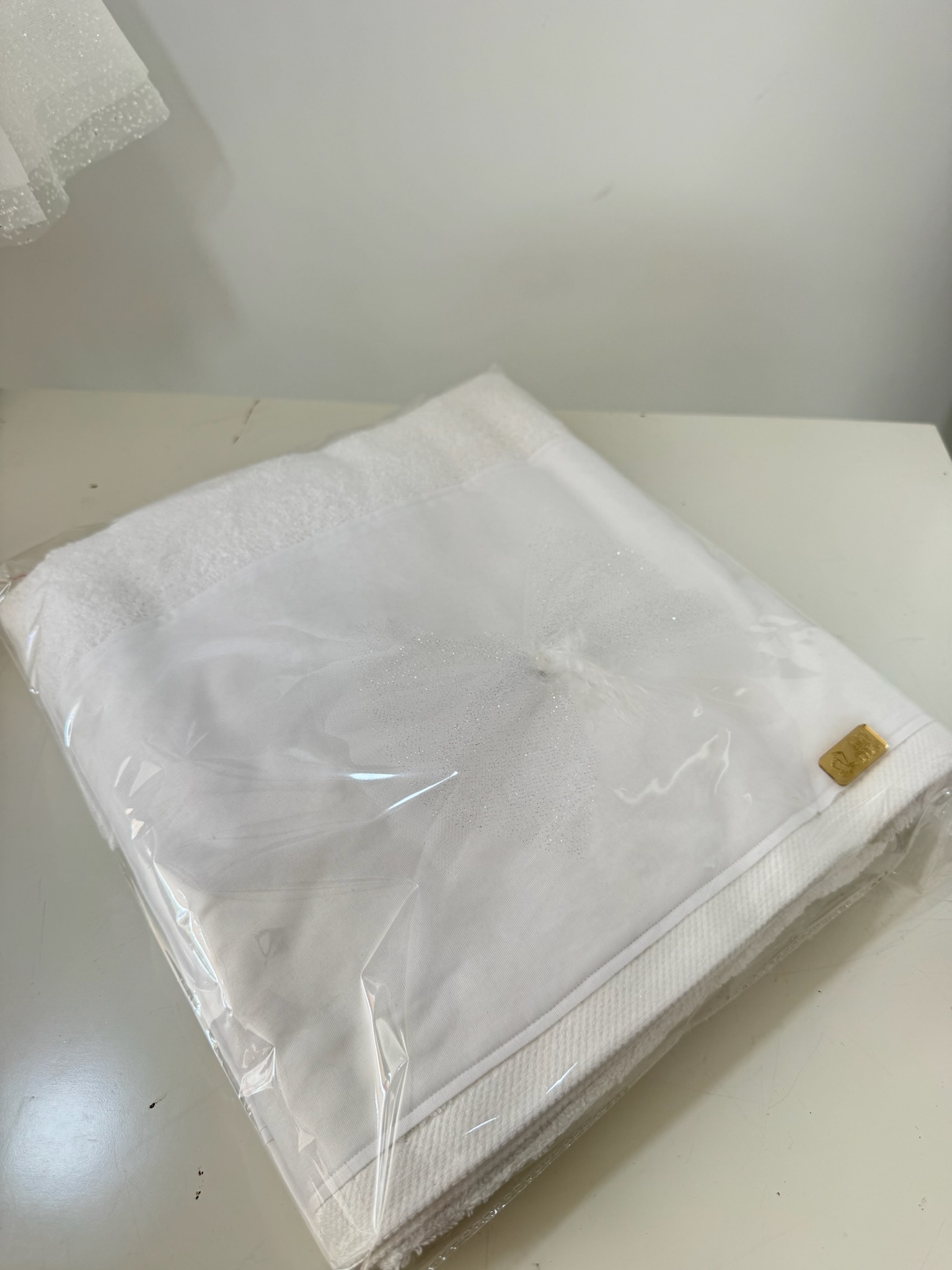 Χειροποίητο σετ με λαδόπανα για κορίτσι, με λευκή φάσα, ροζ τούλινο φιόγκο και γκλίτερ.