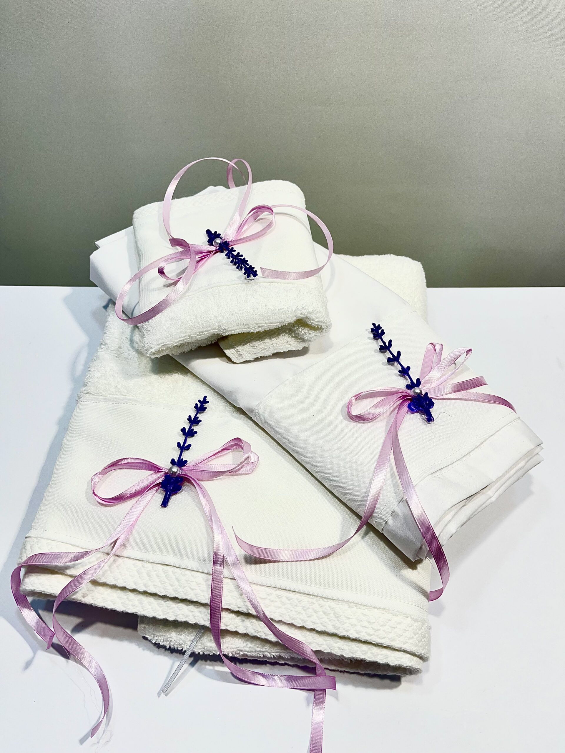Χειροποίητο σετ λαδόπανα για κορίτσι με θέμα λεβάντα, λευκή φάσα, λιλά κορδέλα και διακοσμητικό κλωνάρι λεβάντας.