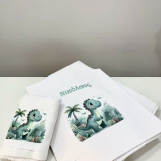 Χειροποίητο σετ λαδόπανα για αγόρι, με γαλάζια φάσα και κίτρινο διακοσμητικό φιόγκο.