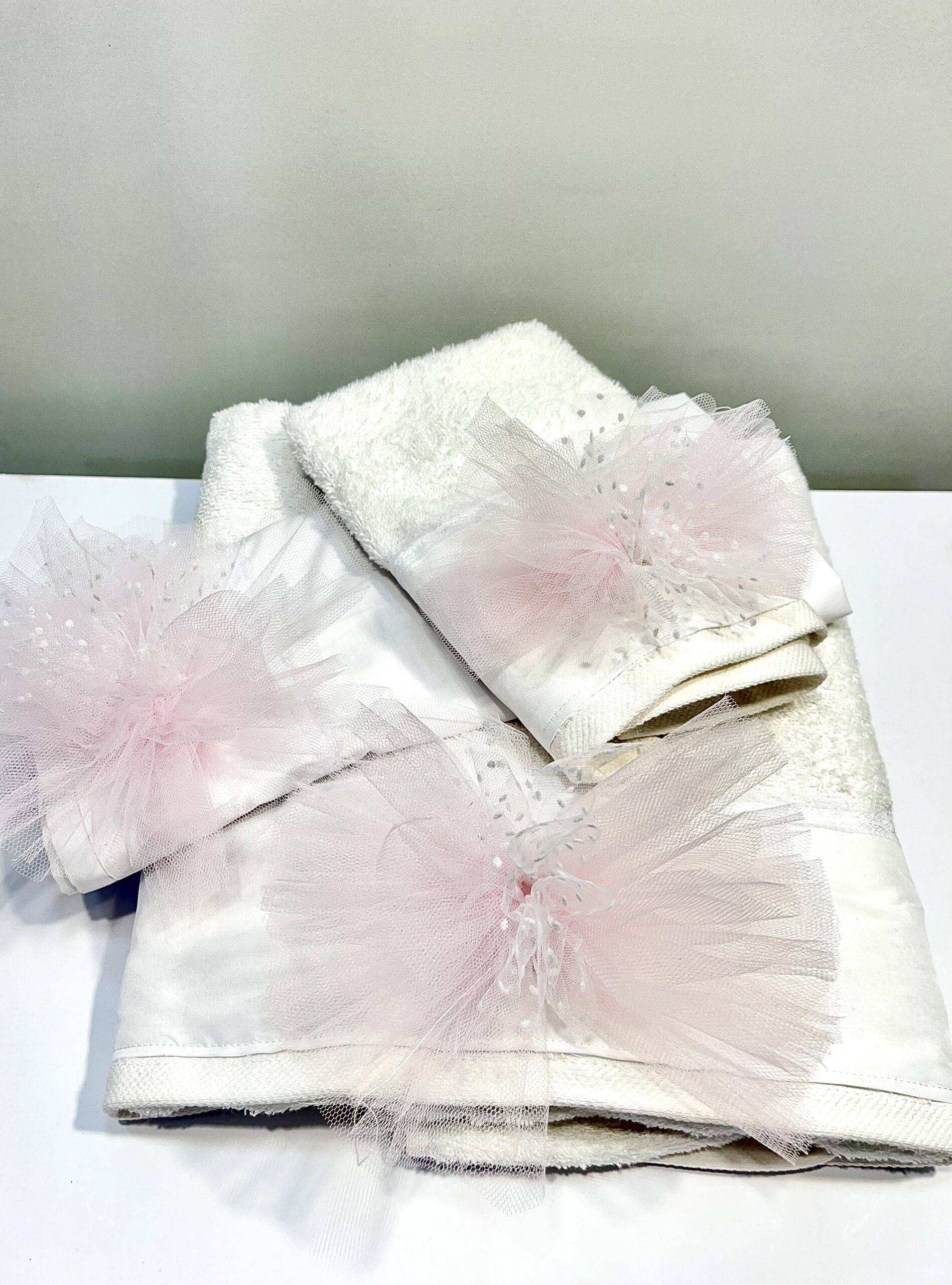 Χειροποίητο σετ λαδόπανα για κορίτσι, με λευκή φάσα και ροζ και πουά τούλι.