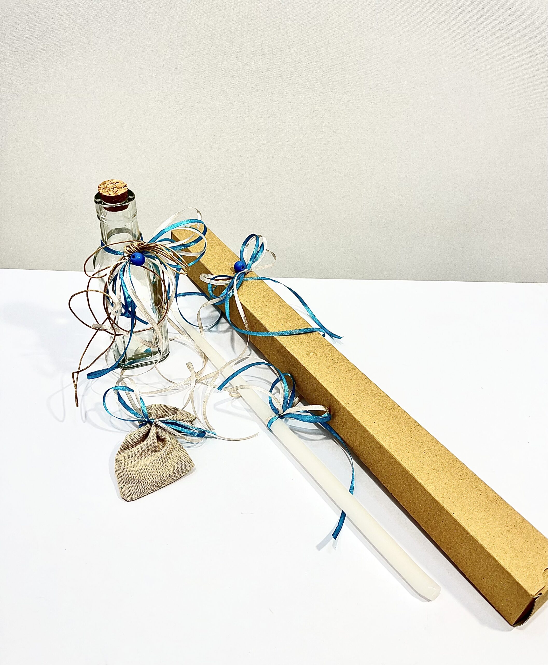 Χειροποίητο λαδοσέτ για αγόρι με εκρού και γαλάζια κορδέλα, σχοινί σε φυσικό χρώμα και μπλε διακοσμητική χάντρα.