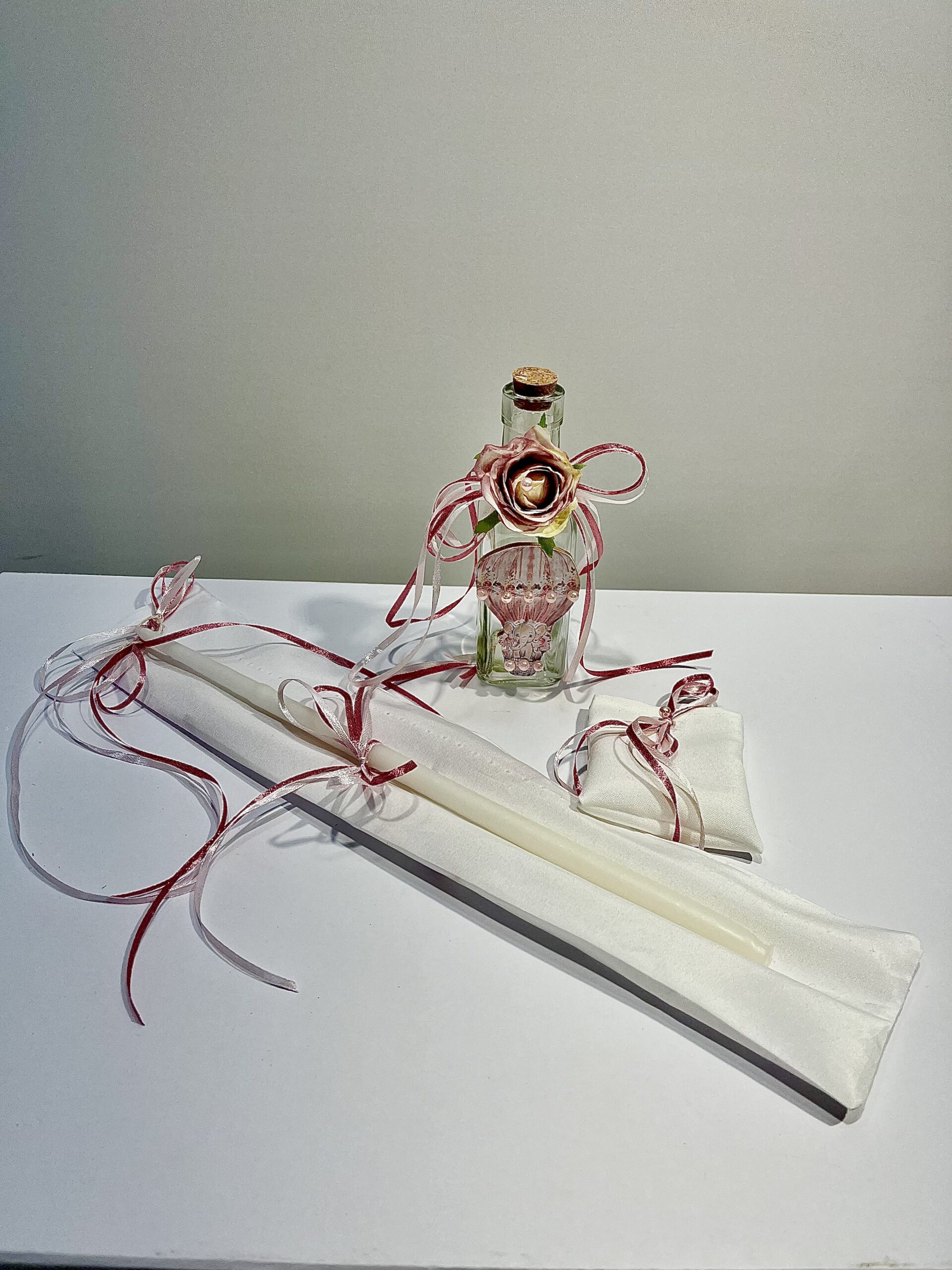 Χειροποίητο λαδοσέτ για κορίτσι με εοζ τριαντάφυλλο, λευκή κορδέλα και πέρλα.