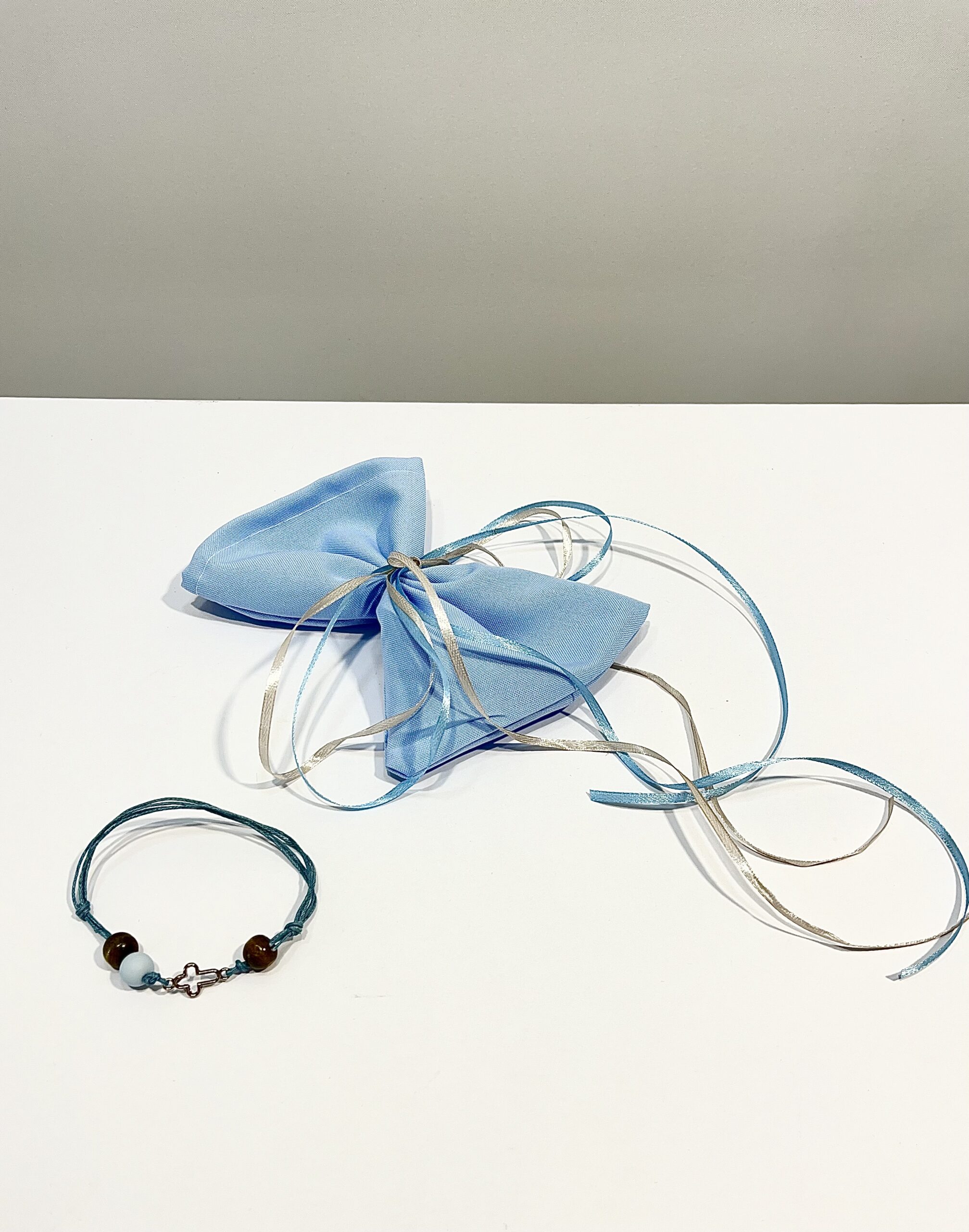 Χειροποίητα μαρτυρικά με εκρού σχοινί, χρυσό σταυρό και μπλε χάντρα, 50 τεμάχια.