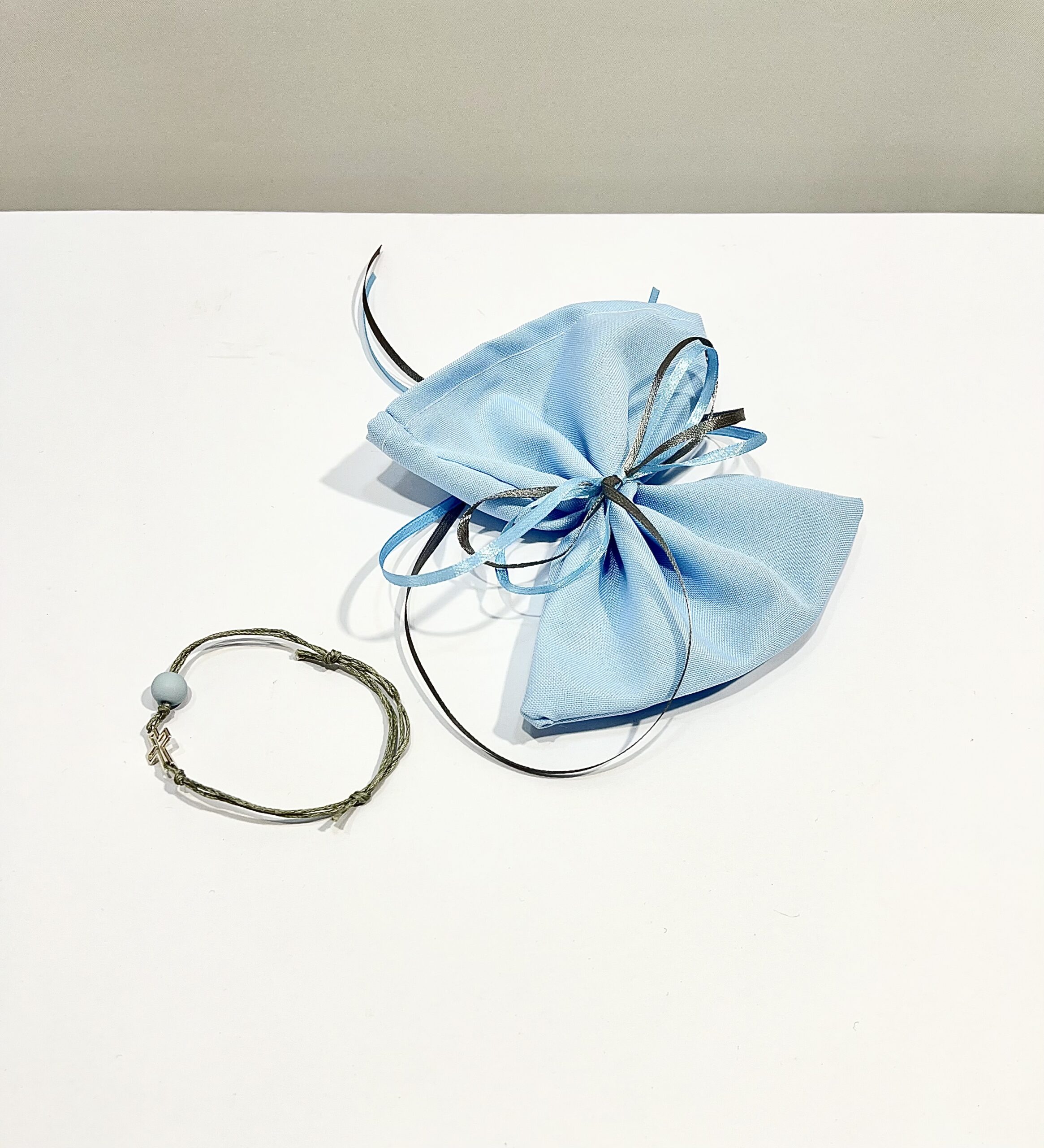 Χειροποίητα μαρτυρικά με γκρι σχοινί, ασημί σταυρό και γαλάζια χάντρα, 50 τεμάχια.