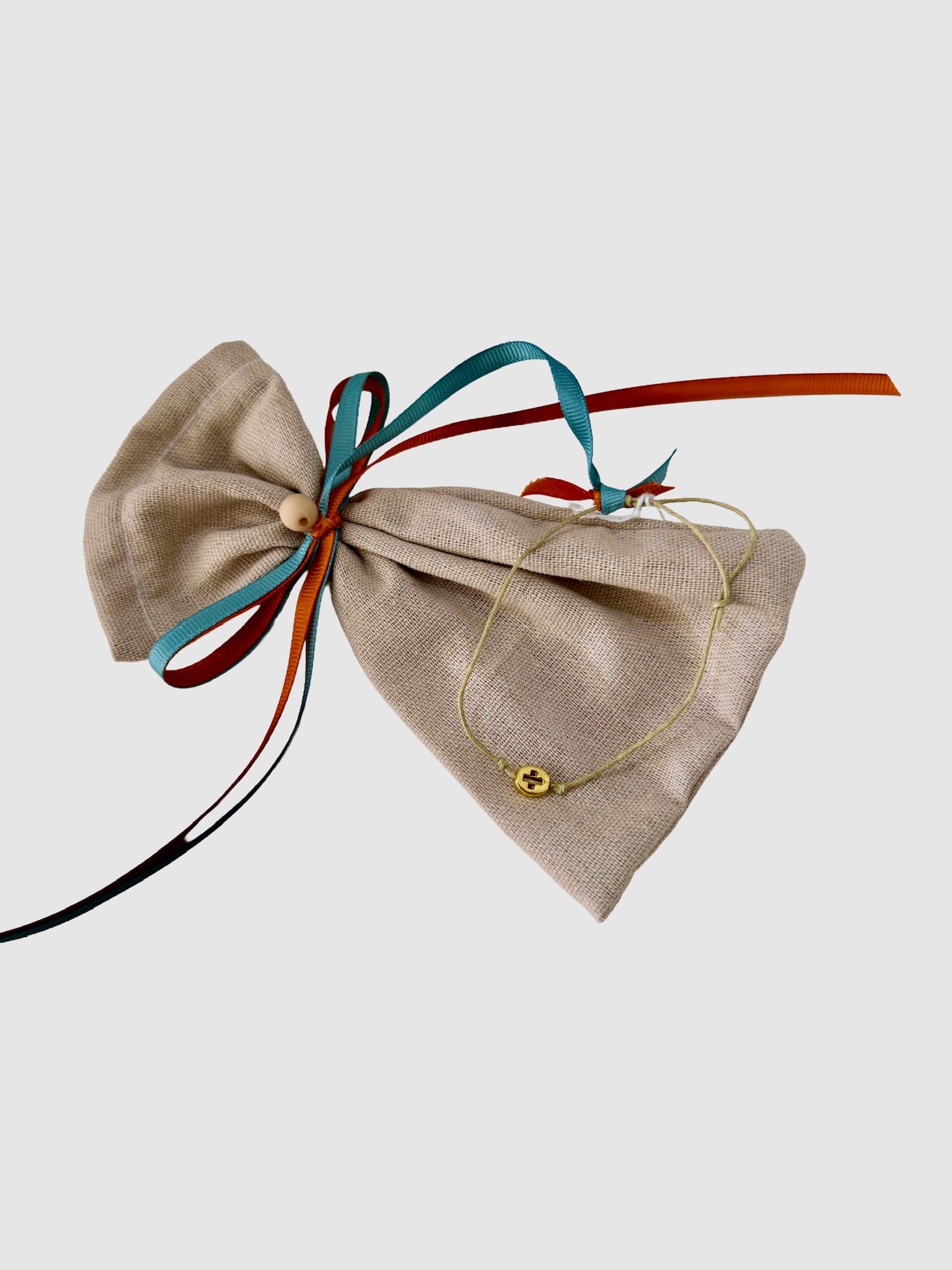 Χειροποίητα μαρτυρικά με εκρού σχοινί, χρυσό σταυρό και βεραμάν χάντρα, 50 τεμάχια.