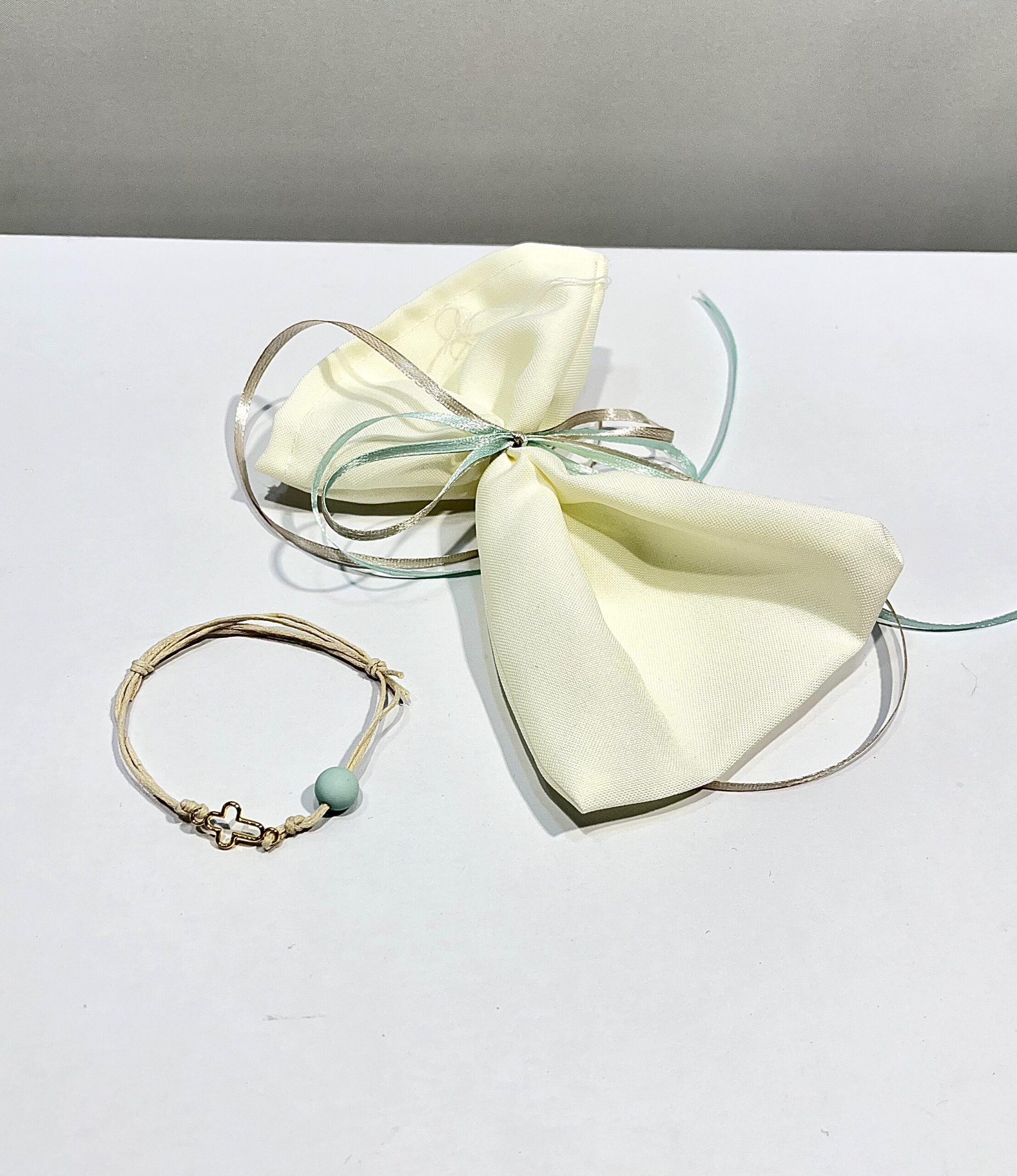 Χειροποίητα μαρτυρικά με εκρού σχοινί, χρυσό σταυρό και χρυσή μπίλια, 50 τεμάχια.