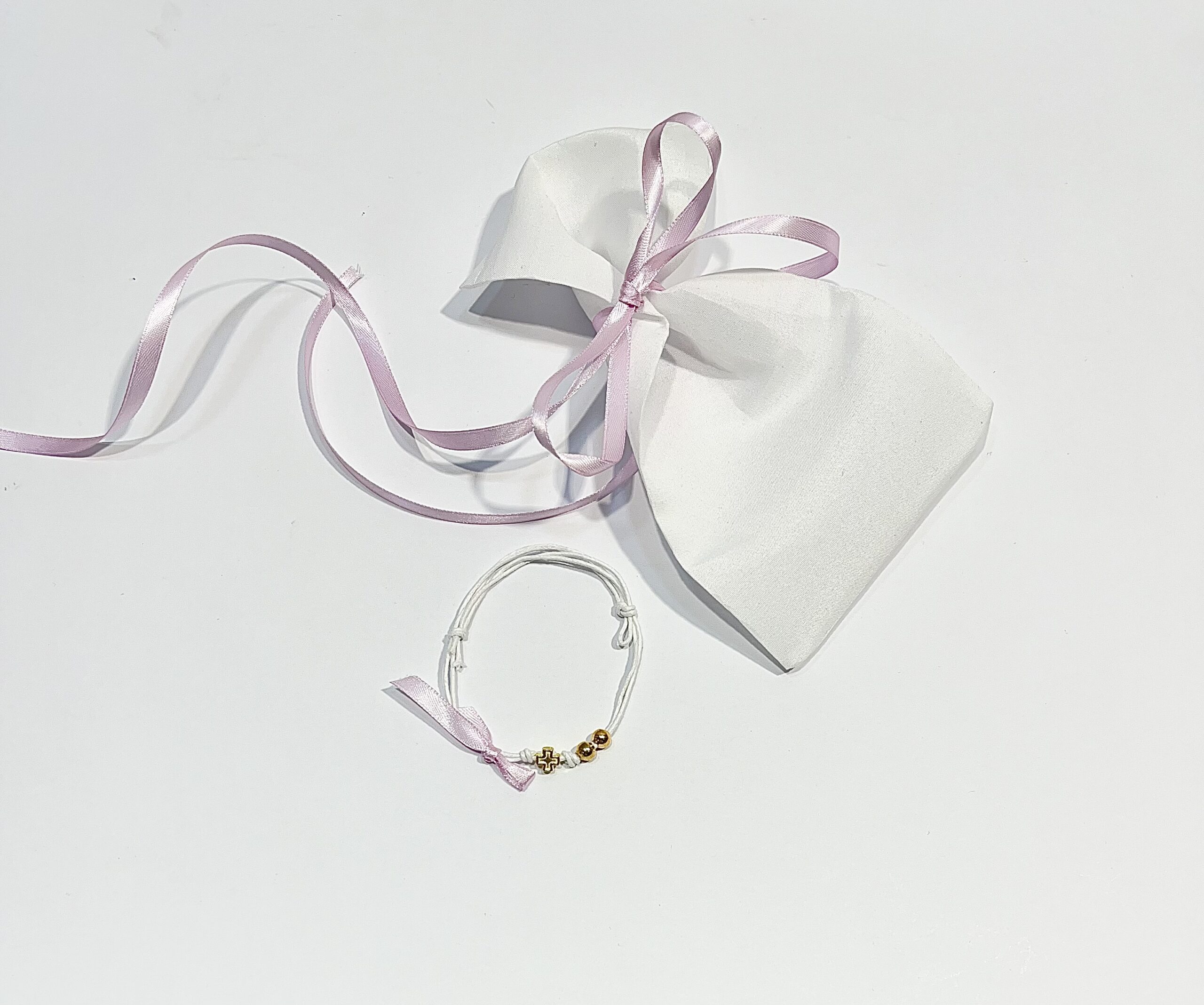Χειροποίητα μαρτυρικά με λευκό σχοινί, χρυσό σταυρό, λιλά κορδέλα και χρυσές διακοσμητικές χάντρες, 50 τεμάχια.