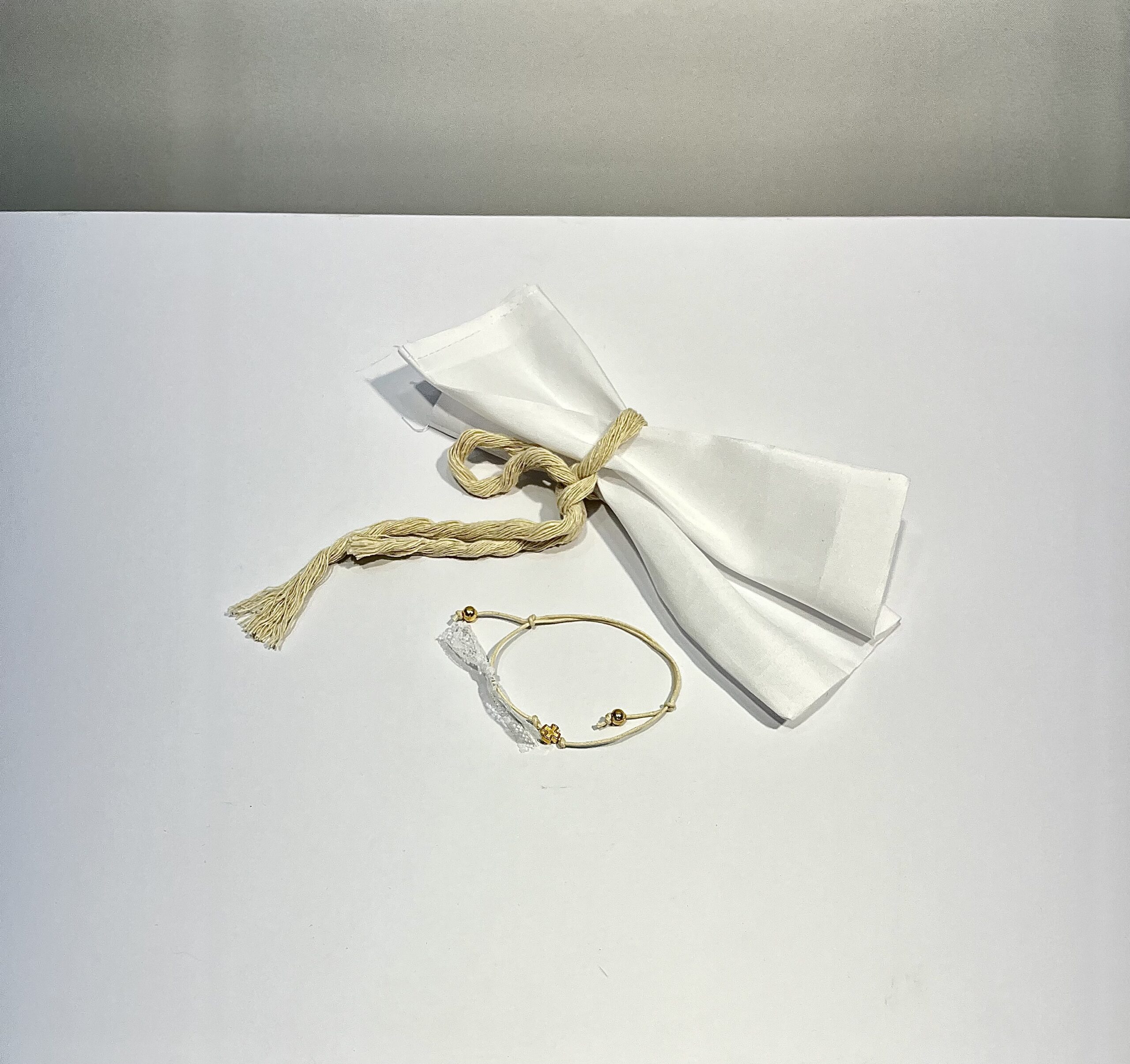 Χειροποίητα μαρτυρικά με λευκό σχοινί, χρυσό σταυρό, Κωνσταντινάτο, χρυσή χάντρα και λευκή πέρλα , 50 τεμάχια.