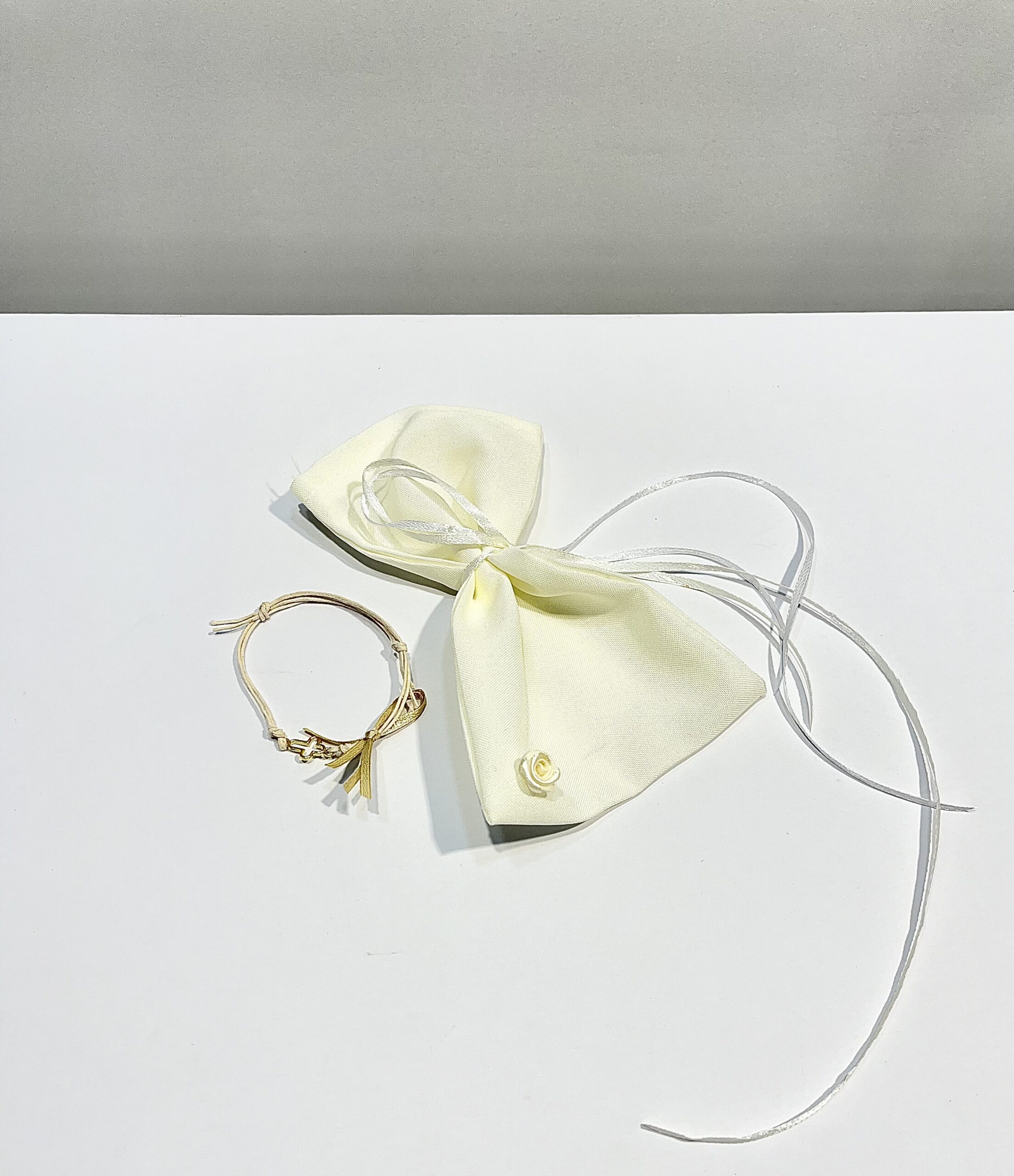 Χειροποίητα μαρτυρικά με εκρού σχοινί, χρυσό σταυρό και χρυσή μπίλια, 50 τεμάχια.
