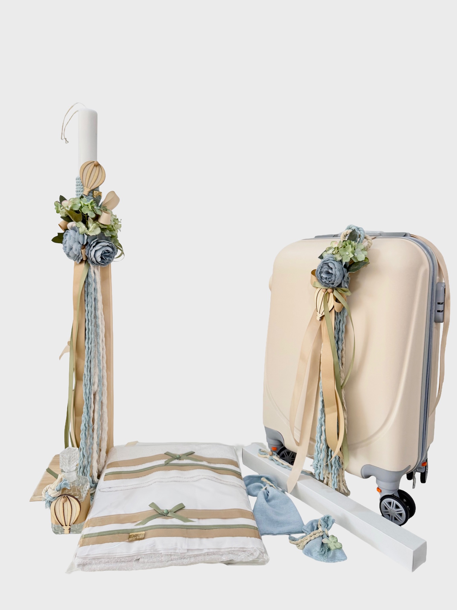 Χειροποίητο πακέτο βάπτισης για αγόρι με θέμα αερόστατο. Το πακέτο περιλαμβάνει τη βαλίτσα, τη λαμπάδα, τα λαδόπανα, το λαδοσέτ και 50 μαρτυρικά.