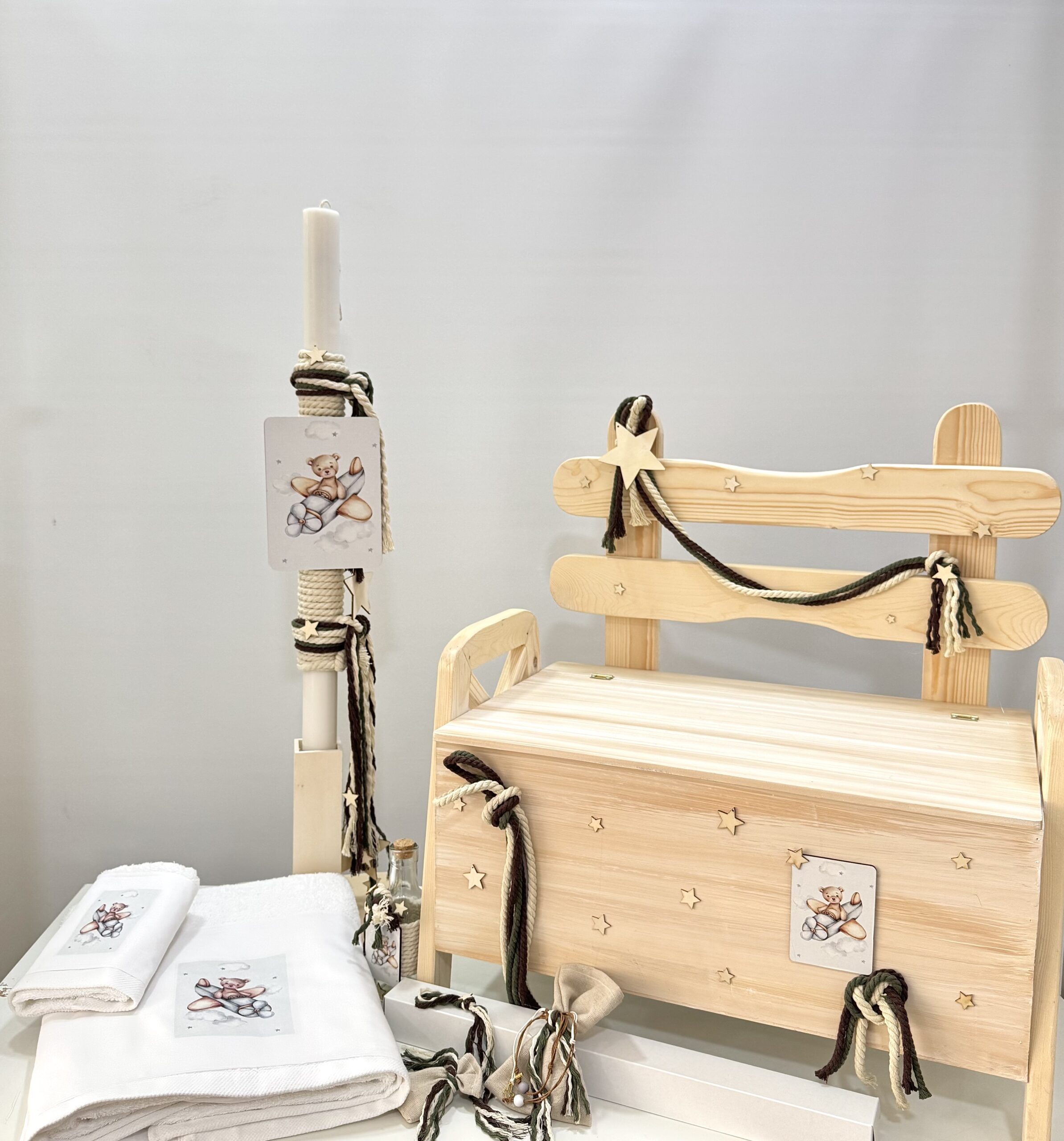 Χειροποίητο πακέτο βάπτισης για αγόρι με θέμα αρκουδάκι σε αεροπλάνο . Το πακέτο περιλαμβάνει τη βαλίτσα, τη λαμπάδα, τα λαδόπανα, το λαδοσέτ και 50 μαρτυρικά.