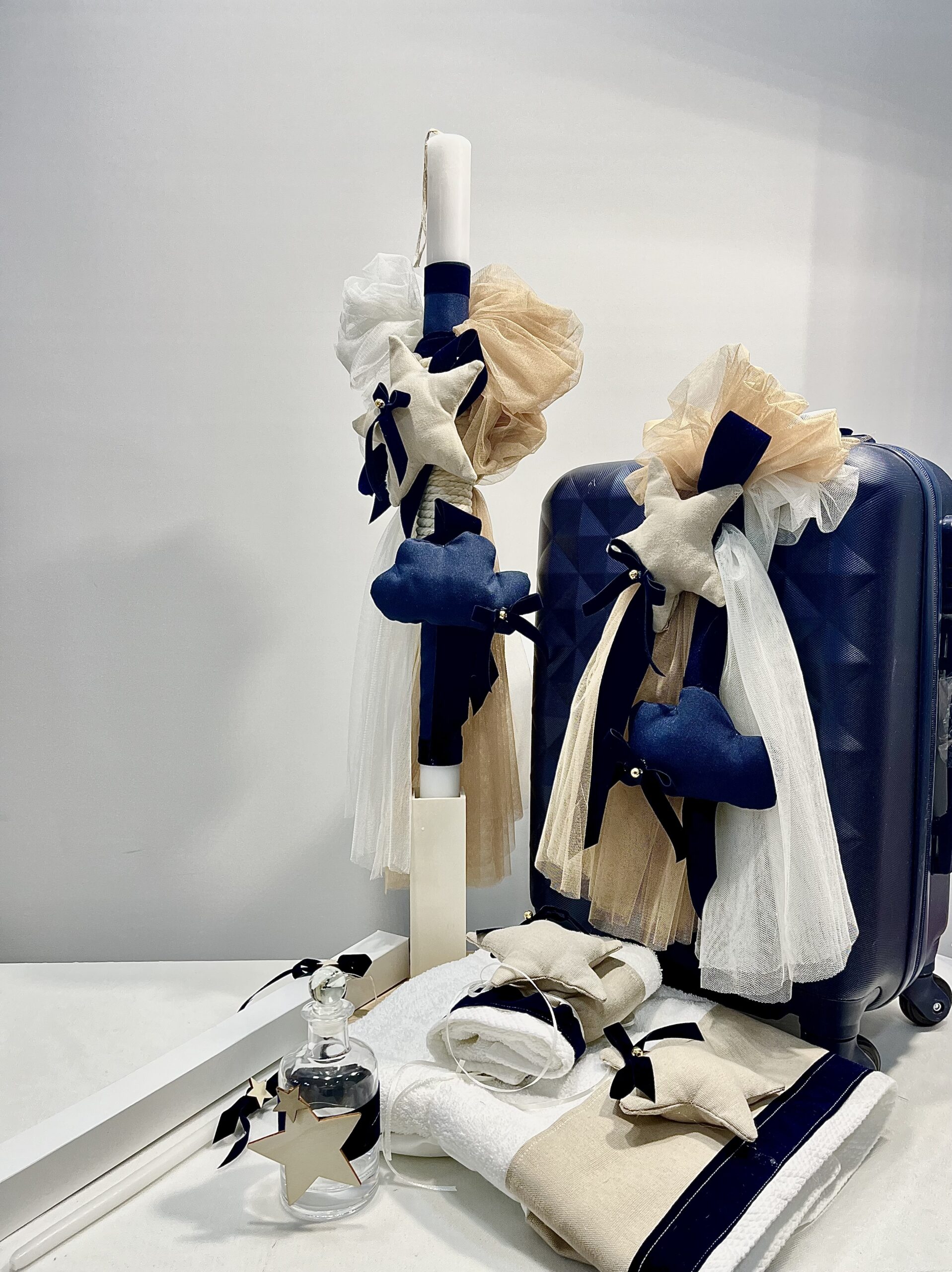 Χειροποίητο πακέτο βάπτισης για αγόρι με θέμα αστεράκι και συννεφάκι. Το πακέτο περιλαμβάνει τη βαλίτσα, τη λαμπάδα, τα λαδόπανα, το λαδοσέτ και 50 μαρτυρικά.
