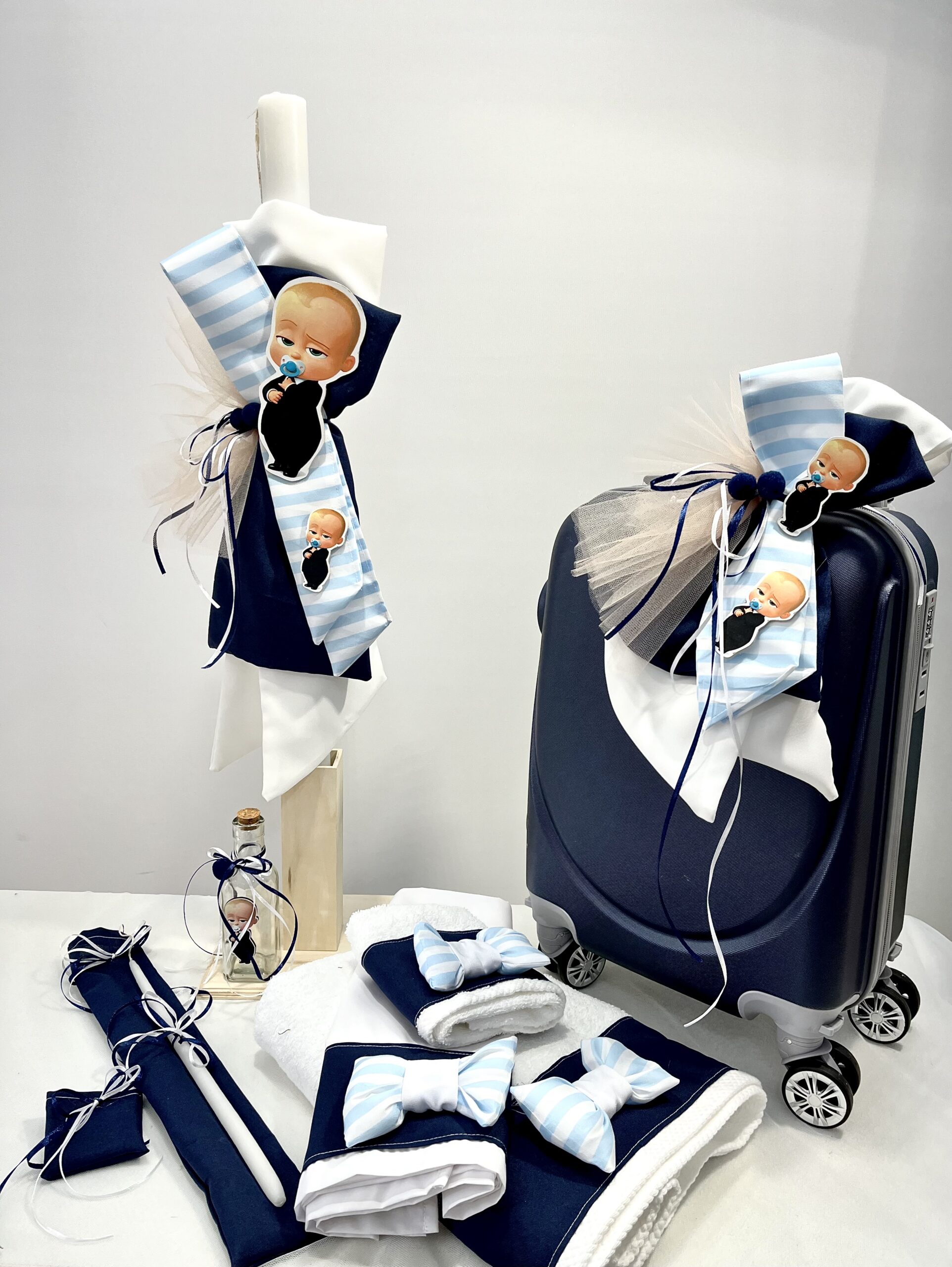 Χειροποίητο πακέτο βάπτισης για αγόρι με θέμα Baby Boss. Το πακέτο περιλαμβάνει τη βαλίτσα, τη λαμπάδα, τα λαδόπανα, το λαδοσέτ και 50 μαρτυρικά.