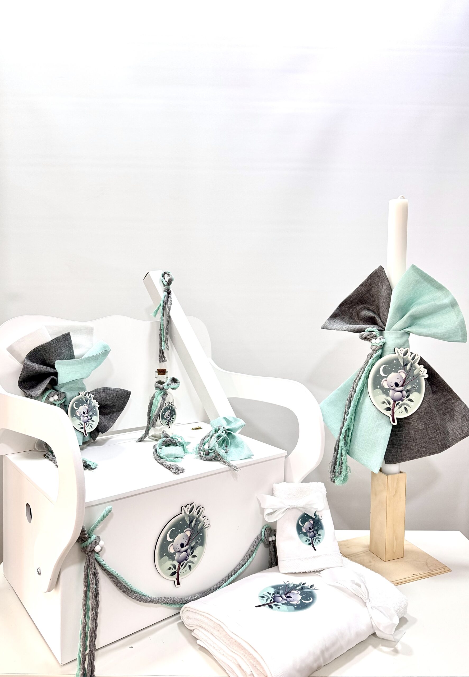 Χειροποίητο πακέτο βάπτισης για αγόρι με θέμα κοάλα. Το πακέτο περιλαμβάνει το παγκάκι, τη λαμπάδα, τα λαδόπανα, το λαδοσέτ και 50 μαρτυρικά.