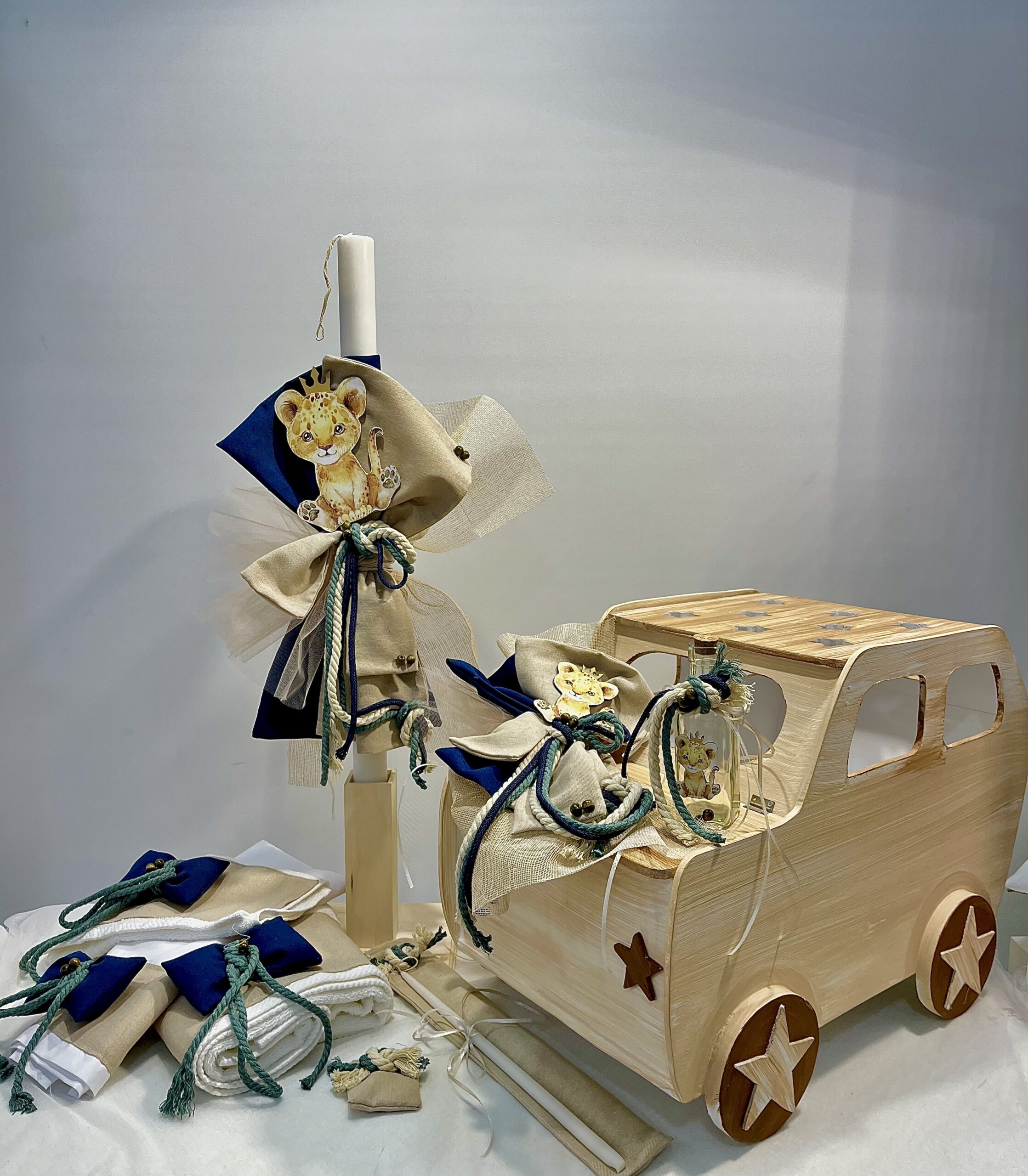 Χειροποίητο πακέτο βάπτισης για αγόρι με θέμα σίμπα. Το πακέτο περιλαμβάνει το τζιπ, τη λαμπάδα, τα λαδόπανα, το λαδοσέτ και 50 μαρτυρικά.