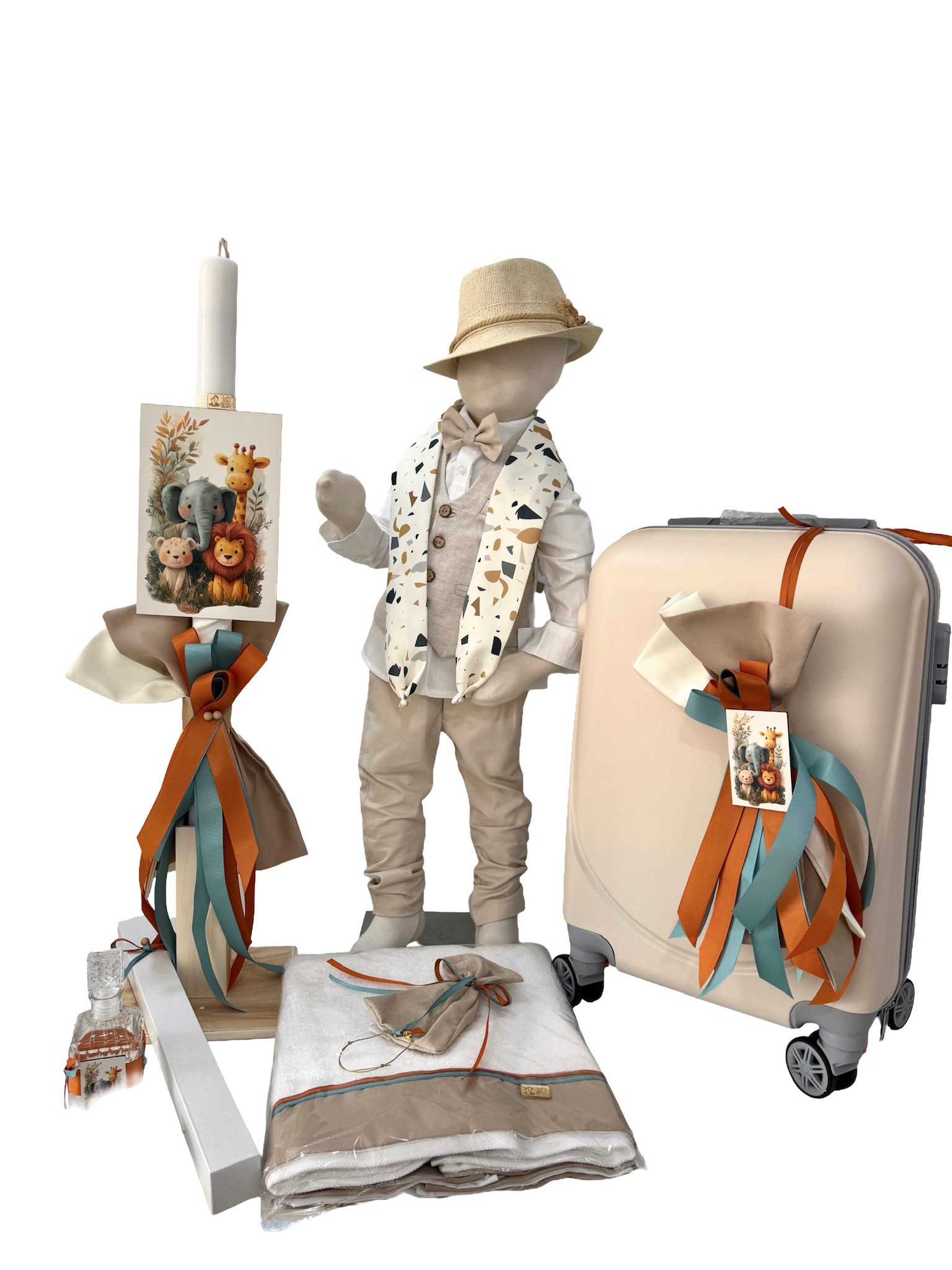 Χειροποίητο πακέτο βάπτισης για αγόρι με όνομα της επιλογής σα;. Το πακέτο περιλαμβάνει τη βαλίτσα, τη λαμπάδα, τα λαδόπανα, το λαδοσέτ και 50 μαρτυρικά.
