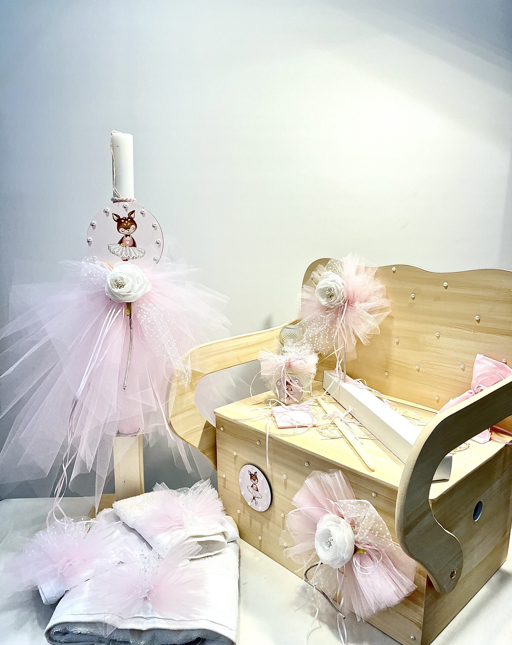 Χειροποίητο πακέτο βάπτισης για κορίτσι με θέμα ελαφάκι μπαλαρίνα. Το πακέτο περιλαμβάνει το παγκάκι, τη λαμπάδα, τα λαδόπανα, το λαδοσέτ και 50 μαρτυρικά.