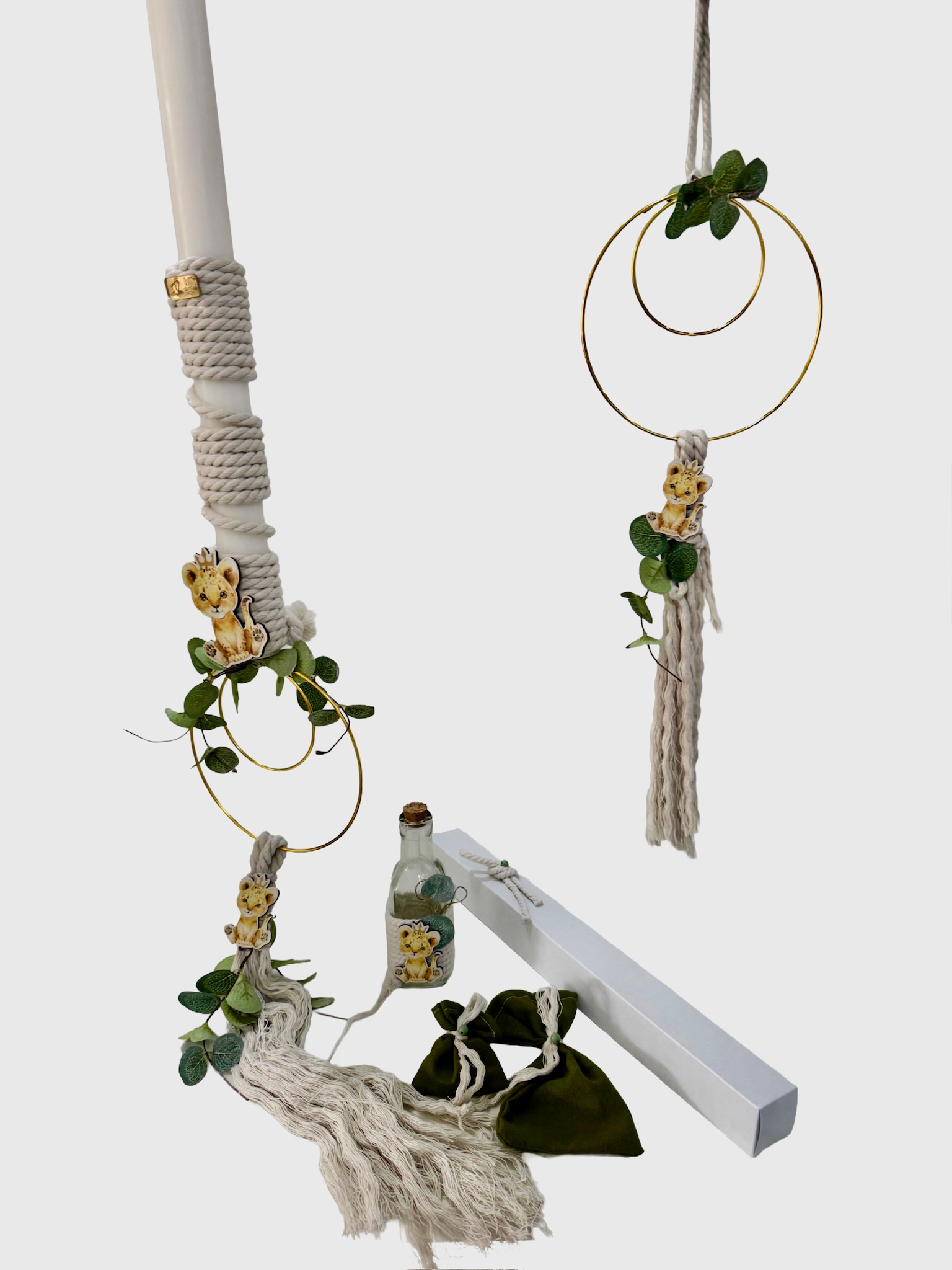 Χειροποίητο σετ λαμπάδας για αγόρι με κρεμαστή λαμπάδα και θέμα τιγράκι. Το σετ περιλαμβάνει τη λαμπάδα, το μπρανς και το λαδοσέτ.