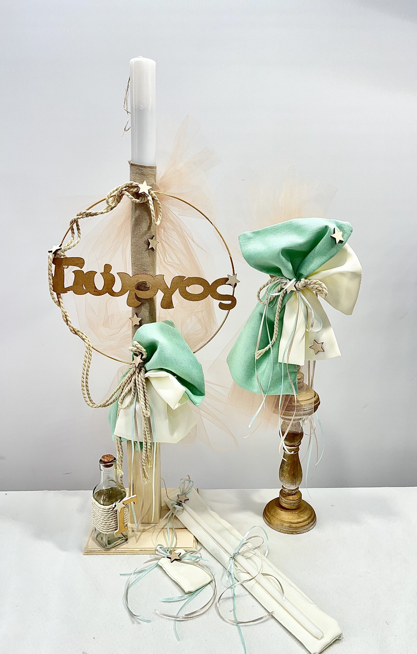 Χειροποίητη λαμπάδα και μπρανς για αγόρι με όνομα της επιλογής σας. Με εκρού και βεραμάν πανί, καραβόσχοινο και διακοσμητικά αστεράκια.