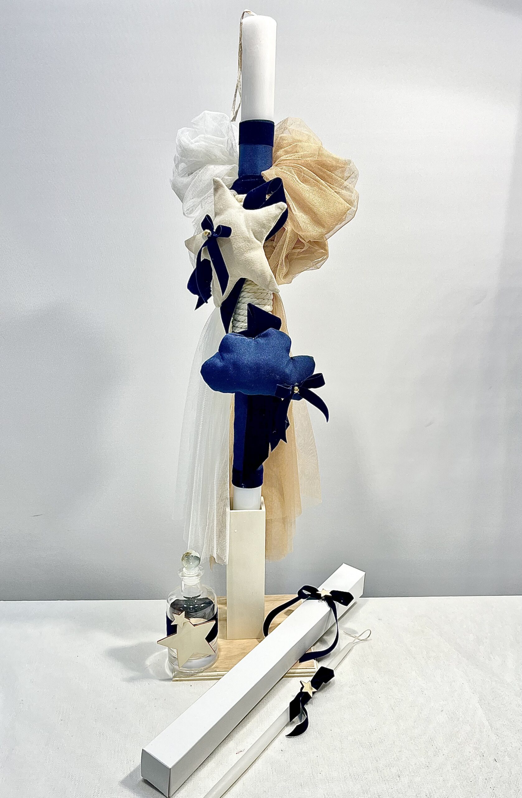 Χειροποίητο σετ λαμπάδας για αγόρι με θέμα αστεράκι και συννεφάκι. Το σετ περιλαμβάνει τη λαμπάδα, το μπρανς και το λαδοσέτ.