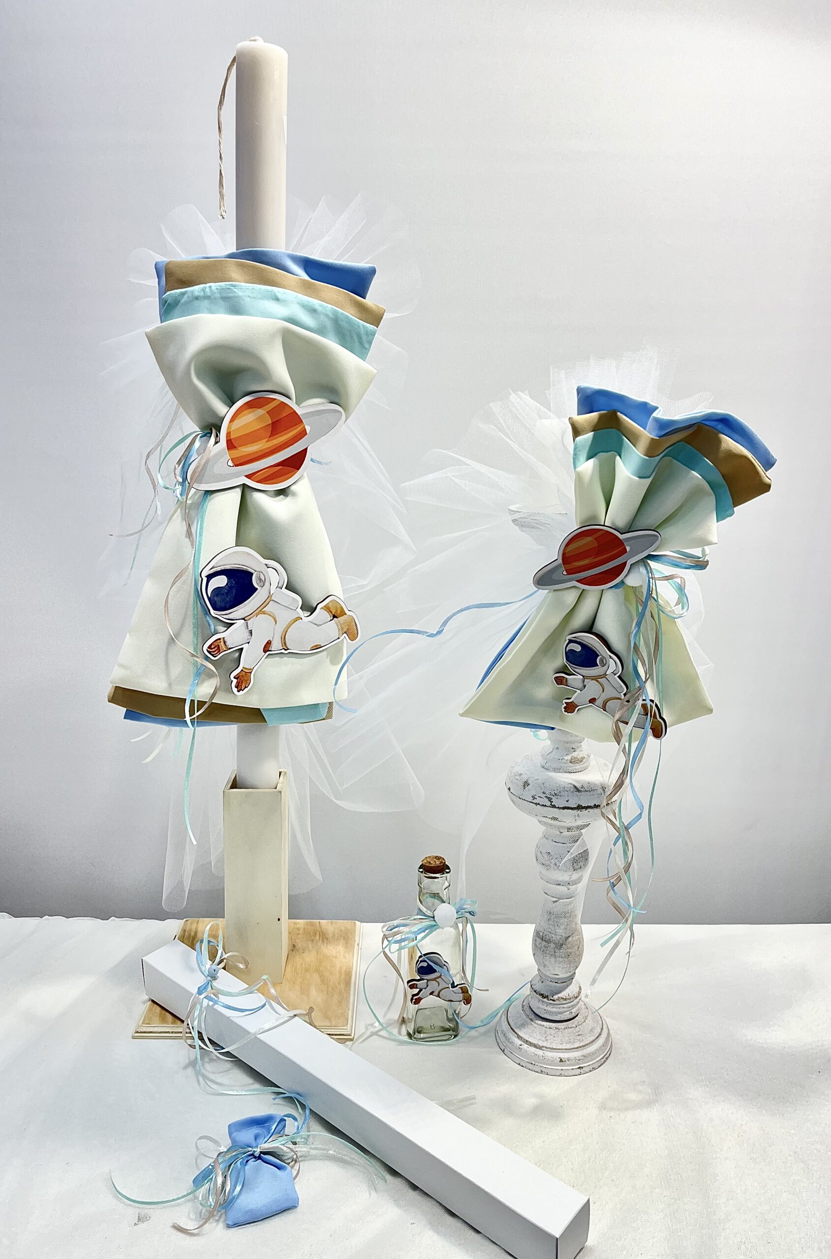 Χειροποίητο σετ λαμπάδας για αγόρι με θέμα αστροναύτη. Το σετ περιλαμβάνει τη λαμπάδα, το μπρανς και το λαδοσέτ.